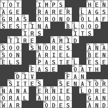 ACROSS 1. Small child 4. Naughty children 8. Layer 11. Personal question 12. More uncommon 14. Fails to keep up a pace 15. Pate de foie ____ 17. U. of Maine site 18. Norwegian king 19. French poetic form 21. Vital fluid 23. Big collection agency 24. It is 25. Hoop that covers a wheel 27. Among 30. "Barney Miller" actor Jack 31. Sounds asleep 34. Santa ___, CA 37. Boy, to dad 38. Satellite of Uranus 39. Benjamin's nick name 40. Raised railways 41. Soft color 43. Compass dir. 44. Comfort 45. Pledge 47. HTML Container Element 49. Air blower 50. Locates 52. Elected representative 56. Grandmother 57. Bert's buddy 60. Old wives' tales, e.g. 61. Relating to the mouth 62. Hold, grip (Informal) 63. Separate the seeds from cotton 64. Armed conflict 65. Lyric poems 66. Added to DOWN 1. Labels 2. Legendary monster 3. Beverages made from leaves 4. Removes the wrinkles 5. Hindu Mythology: god of death 6. Adept person 7. Elected rep. 8. Rings 9. Mild oath 10. Overdraft (abbr.) 13. Director Reiner 14. Spoils 16. Commotion 20. Angers 22. Flaplike covering 25. Instrument 26. Charged atoms 27. Get up 28. Rendezvous 29. Capri or Wright 30. Compass dir. 32. California wine valley 33. Mouths or openings 34. Collude with 35. Tender 36. A saturated hydrocarbon 42. Grant temporary use of 44. Night before a holiday 46. Of or related to the anus 47. Middle Eastern gold or silver currency 48. Slanted text style (abbr.) 49. Eats 50. "Two Mules for Sister ____" 51. Ocean 52. Drop; flow; fall 53. Ancient Roman robe 54. NW Algerian seaport 55. Tear apart 56. At this time 58. 17th letter of the Greek alphabet 59. Dreamland