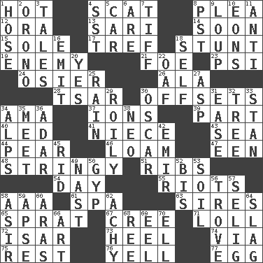 ACROSS 1. Being at a high temperature 4. Scram, to a cat 8. Entreaty 12. Mouth or opening 13. Indian skirt 14. Within a short period 15. Flatfish 17. Not kosher 18. Difficult or unusual or dangerous feat 19. Foe 21. Enemy 23. Air pressure measure (abbr.) 24. Flexible twig of a willow tree 26. Insect wing 28. Russian ruler of old 30. Compensates for 34. Wet nurse (var.) 37. Charged particles 39. Component 40. Directed 41. Sibling's daughter 43. Ocean 44. Lightbulb-shaped fruit 46. Rich soil 47. Car or cant ending 48. Slender, wiry 51. Teases 54. 24 hours 55. Disturbances 58. Auto club (abbr.) 61. Health resort 63. Founders of families 65. Small fatty European fish 67. Algonquian 71. Hang loosely or laxly 72. Austrian river, tributary to the Danube 73. Person who is morally reprehensible 74. By way of 75. Repose 76. Shout 77. Oval reproductive body of a fowl DOWN 1. Stockings 2. U. of Maine site 3. Stories 4. Fast jet (abbr.) 5. Automobile 6. "We ___ not amused" (Victoria) 7. Small quarrel 8. Pacific Standard Time (abbr.) 9. Central Nebraska county 10. Immeasurably long periods of time 11. Against 16. Give off 18. Oneself 20. Consenting reply 22. Clumsy lout 25. Precipitation 27. Viper 29. Agitated, as a liquid 30. Motion picture award 31. Comfort 32. Relationship diagram 33. Comedian Laurel of Laurel & Hardy 34. High mountains 35. Rendezvous 36. The sixth month of the Jewish calendar 38. Modern: prefix 42. Independent ruler or chieftain 45. To free from 49. Political cartoonist Thomas 50. Swindle 52. Altar cloth linen 53. The visible part of the earth's surface 56. Collection of objects 57. Major League Baseball Commissioner Bud 58. SW Saudi Arabia district 59. Domed church section 60. Caspian sea tributary 62. Painful 64. Volcanic refuse 66. Nonscientific branch of learning 68. Portuguese money of account (variant) 69. Snakelike fish 70. Pipe bend
