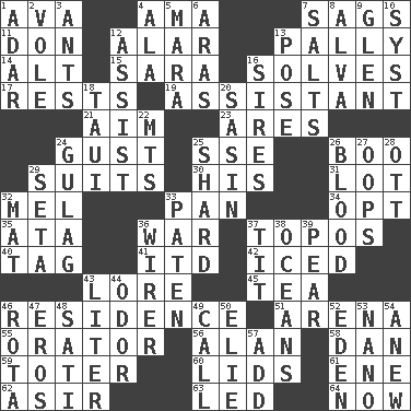 ACROSS 1. Actress Gardner 4. Nursemaid (var.) 7. Sinks 11. Spanish title 12. Having or resembling wings 13. Chummy 14. The first octave above the treble staff 15. "Two Mules for Sister ____" 16. Finds the solution 17. Musical pauses 19. Helper 21. Direct toward a target or goal 23. Ancient Greek god of war 24. Abrupt rush of wind 25. Compass dir. 26. Oct. 31 cry 29. Sets of matching outer garments 30. Part of HMS, perhaps 31. Car dealer's back yard 32. Cartoonist voice _ Blanc 33. Baking dish 34. Choose 35. "One Day ___ Time" 36. Armed conflict 37. Traditional theme or motif 40. Label 41. It would 42. On the rocks 43. Old wives' tales, e.g. 45. Afternoon social gathering 46. Home 51. Sports stadium 55. Speaker 56. ____ Jay Lerner 58. One of the 12 tribes of Israel 59. Carrier 60. Flaplike coverings 61. Compass dir. 62. SW Saudi Arabia district 63. Directed 64. At this time DOWN 1. The sixth month of the Jewish calendar 2. Grand slam 3. Pismires 4. Chicken ___ king 5. Hindu Mythology: god of death 6. Ancient river in northeast Turkey 7. Table seasonings 8. Inventor's middle name 9. Small, secluded valley 10. System (abbr.) 12. Help 13. Introduce or present, as a question 16. Titles for men of rank and authority 18. "Change" in Tahitian 20. Indian antelope 22. Mountains (abbr.) 24. POW camp 25. Pottery fragment 26. Vital fluid 27. I made a mistake 28. Baseball player Mel 29. Stalk of a moss capsule 32. Floor protector 33. Eucharist need 36. One who wires 37. Teat (slang) 38. Seas 39. Lightbulb-shaped fruit 43. 61 cubic inches 44. Aroma 46. Round or rotation of duties 47. Greek god of love 48. Suttee (variant) 49. Give a ring to 50. Writer Wiesel 52. Paradise 53. Billionth: prefix 54. Afresh 57. Say or write further