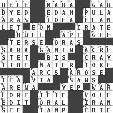 ACROSS 1. Ubangi River tributary 5. Hindu Mythology: god of death 9. Slender fish 12. Colored 13. Dutch treat 14. Monetary unit of Botswana 15. Caspian sea tributary 16. The content of cognition 17. Flair 18. Allow 19. Age 21. Feeling or showing extreme anger 22. Frame or body of a ship 24. Fitting 26. Turn to the right 27. Laconic 28. Mouths or openings 29. "Two Mules for Sister ____" 30. Street urchin 32. 43,560 square feet 36. Proofreading order 37. Again 38. Supercomputer manufacturer 39. Event that recurs at intervals 40. Mother 42. Puff or smoke 43. Arches 44. Came up 46. Afternoon social gathering 49. By way of 50. Without 51. Sports stadium 53. Slangy assent 54. Armed conflict 57. Old wives' tales, e.g. 58. Wig 61. Short-tailed, large-bodied rat 62. Prepare for publication 63. Taken by mouth 64. SW Asia republic 65. Perceive with the eye 66. Pack (down) 67. Singer Brickell DOWN 1. Hereditary estate 2. Jane of fiction 3. Resembling or made to resemble leather 4. Begley and Asner 5. Chow _ 6. Increase 7. Actress Charlotte 8. Housemaid (var.) 9. POW camp 10. Having winglike extensions 11. The wife of a rajah (variant) 14. For each 19. Raised railways 20. Cassini of fashion 21. ___ a Wonderful Life 23. A salt of uric acid 24. Originate 25. Baking dish 27. Jacques of French films 28. Leaves out 29. Fast jet (abbr.) 31. Phillipine bananalike plant 32. NE Massachussets city 33. What you're doing now 34. Immoral or dissolute person 35. Sight organ 40. Medical imaging device (abbr.) 41. To erase 43. Actress Gardner 45. Strike 46. Lies 47. Wear away 48. Nest on high 52. Fish or hair follower 53. Sharp bark 55. Mountain range southwest of Kyrgyzstan 56. French philosopher Descartes 58. Small child 59. Epoch 60. Scottish cap 61. Compete