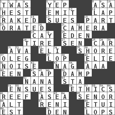 ACROSS 1. It was, poetically 5. Slangy assent 8. White ___ sheet 11. Command 12. Send forth 14. Pet locale 15. Swept the length of 17. Takes to court 18. Component 19. Declaimed 21. Device for capturing images 23. Island 25. Locale of original sin 26. Hoop that covers a wheel 27. Elected rep. 28. Auto 31. Actress Gardner 33. Biblical high priest 35. Dinah or Pauly 37. Cassini of fashion 38. Trim (branches) 40. Writer Wiesel 41. Annoying sound 43. Tired old horse 45. Auto club (abbr.) 46. Car or cant ending 47. Plant excrement 50. Moist 52. Nanny 53. R.R. building 54. Takes place subsequently 56. Principles of right and wrong 61. Coral ridge 62. Toward the sea 65. Sir (Sp.) 66. The first octave above the treble staff 67. Painter Guido (1575-1642) 68. Needle holder 69. Eastern Standard Time (abbr.) 70. Lair 71. Chops off DOWN 1. Through, poetically 2. Put on (as clothing) 3. "____ silly question..." 4. Proofreading order 5. Consenting reply 6. Australian flightless bird 7. Parts 8. Having or resembling wings 9. "Two Mules for Sister ____" 10. Fitting 13. Sadhe (variant) 16. Tenth: prefix 18. Writing instrument 20. Have the gumption 22. Not women's 24. Shout 26. Labels 28. Root beer relative 29. Roberta Peters solo 30. To separate or throw off 31. Medicinal plant 32. Distinctive style or manner 34. Electrically charged atom 36. Pile 37. Single 39. Groovy apts. 42. He sold his birthright 44. Yard entry 48. Approach 49. Went by 51. Floor coverings 52. Overdraft (abbr.) 54. Snakelike fish 55. Remaining after all deductions 57. Person who is morally reprehensible 58. To the inside or interior of 59. Clever action or accomplishment 60. Indian titles of respect 61. Actress Charlotte 63. Compass dir. 64. The 18th letter of the Arabic alphabet