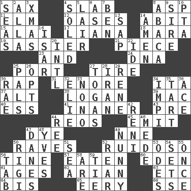 ACROSS 1. Saxophone 4. Thick slice 8. Cleo's killer 11. Shade tree 12. Fertile tracts in a desert 14. "This won't hurt ____!" 15. Jai _ 17. Climbing, woody, usually tropical vines 18. Hindu Mythology: god of death 19. More disrespectful 21. Part 23. Plus 24. Heredity factor (abbr.) 25. Left side of a ship or aircraft 27. Hoop that covers a wheel 30. Hit sharply and swiftly 31. Poe poem 34. Call ___ day 37. The first octave above the treble staff 38. Utah city north of Ogden 39. Apple computer (short form) 40. Double-curved letter 41. Sillier 43. Before (prefix) 44. Vintage cars 45. Give off 47. Color 49. Compass dir. 50. All-night dance parties 52. Boisterous (Brazilian Portuguese) 56. Prong on a fork 57. Ingested 60. Paradise 61. Eons 62. Believer in; advocate of (suffix) 63. And so on (abbr.) 64. Twice 65. Suggestive of the supernatural 66. Compass dir. DOWN 1. Oceans 2. Silent film actress Nazimova 3. Dec. holiday 4. Having a sole or soles 5. Den 6. White ___ sheet 7. Benjamin's nick name 8. Phillipine bananalike plant 9. Male parent of an animal 10. Parent Teacher Assoc. 13. Plant excrement 14. So be it 16. Austrian river, tributary to the Danube 20. International (abbr.) 22. Binary compound 25. Friends 26. Elects 27. Ancient Roman robes 28. SW Asia republic 29. French philosopher Descartes 30. Actress Charlotte 32. Writer Wiesel 33. Words to Nanette 34. Body of Kaffir warriors 35. Small pie 36. Adept person 42. Painter Guido (1575-1642) 44. To separate or throw off 46. Ancient Persian 47. Natives or inhabitants of Denmark 48. Jacques Cousteau's middle name 49. Pet term 50. Swiss mountan, "Queen of the Mountains" 51. Ocean 52. Rump 53. Lyric poems 54. Puts into a specified state 55. Single time 56. Bar bill 58. "We ___ not amused" (Victoria) 59. Standoff