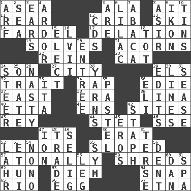ACROSS 1. Toward the sea 5. Chicken ___ king 8. Small island 11. Stern 12. Baby bed with high sides 13. What Jean-Claude Killy likes to do 14. Pack 17. Accusation by an informer 19. Finds the solution 21. Oak nuts 22. It's straight from the horse's mouth 23. Domesticated feline 24. Boy, to dad 27. Municipality 29. Raised railways 32. Distinguishing feature 34. Hit sharply and swiftly 36. Singer Brickell 37. 90 degrees 38. Epoch 39. Pale green bean 40. Singer James 41. Followers of ems 42. Locates 43. Marina Del _, California 44. Proofreading order 46. Compass dir. 47. It is 50. Part of Q.E.F. 52. Poe poem 55. Inclined 57. Lacking a tonal center or key 59. Fragments 62. Attila the _ 63. South Vietnam president (1954) 64. Fastener 65. River (Sp.) 66. Ovum 67. Inactive volcano in Sicily DOWN 1. Sandy's bark 2. Ocean 3. Hearing organs 4. Zeal 5. "We ___ not amused" (Victoria) 6. Pale purple color 7. Phillipine bananalike plant 8. SW Saudi Arabia district 9. Visual representation of an object 10. Airtight sealed metal containers 12. Music discs 15. Voters do this 16. 57 in ancient Rome 18. Small child 20. Main course 24. Guide 25. Speak pompously 26. Thoroughly unpleasant 28. Entertaining tales 29. Proofreads 30. Citrus fruits 31. Gospel singer Marvin 33. Call ___ day 35. Soft color 36. Biblical high priest 42. Staphylococcus 45. Greek god of love 47. Electrically charged atom 48. Barter 49. Major League Baseball Commissioner Bud 51. Laconic 52. Cowardly lion portrayer 53. Needle case 54. Words to Nanette 55. Symbol (abbr.) 56. Gouge 58. Part of a journey 60. Daniel's nick name 61. Health resort