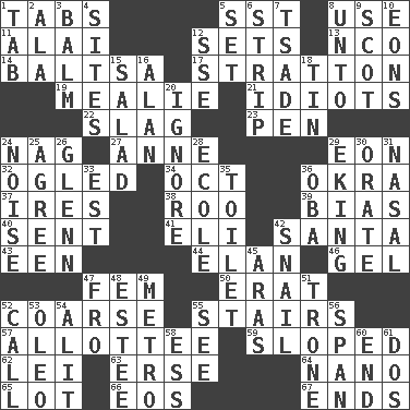 ACROSS 1. Bar bills 5. Fast jet (abbr.) 8. Purpose 11. Mountain range southwest of Kyrgyzstan 12. Puts into a specified state 13. Non-commissioned officer (abbr.) 14. Greek mezzo-soprano Agnes 17. Ski resort town in Vermont 19. Ear of corn 21. Foolish or stupid persons 22. Volcanic refuse 23. Fenced enclosure 24. Tired old horse 27. Queen of England 1702-14 29. Period of immesurable duration 32. Stared at amorously 34. Sep. follower 36. Gumbo ingredient 37. Angers 38. Friend of Pooh 39. Prejudice 40. Posted 41. Biblical high priest 42. Before Barbara or Clara 43. Car or cant ending 44. Liveliness 46. Set 47. Opposite of masc. 50. Part of Q.E.F. 52. Unrefined 55. Flight of steps 57. One to whom something is allotted 59. Slanted 62. Luau accessory 63. Celtic language 64. Billionth: prefix 65. Car dealer's back yard 66. Greek goddess of the dawn 67. Extremities DOWN 1. Keyboard key 2. Chicken ___ king 3. Lip ointment 4. Locates 5. Put into a specified state 6. Long narrow piece of something 7. Sadhe (variant) 8. To (old English) 9. Highlander 10. Immeasurably long periods of time 12. Compass dir. 15. Vegetable dish 16. ____ Jay Lerner 18. Metal container 20. Disregard 24. Annoying sound 25. Match 26. American astronaut and politician John 28. Learning spot: Fr. 29. Supplementing with great effort 30. Speak pompously 31. Relating to the nose 33. Eastern Standard Time (abbr.) 35. Rest room 36. Chief or king in Benin or Nigeria 42. Slow-paced one 45. Ancient river in northeast Turkey 47. Back 48. First name in cosmetics 49. Paris' subway 51. Marketplace scale 52. Give a ring to 53. Butter sub 54. Came down and settled, as after flight 55. Observe 56. Connect, as a bridge 58. Double-curved letter 60. Conclusion 61. Two (Sp.)
