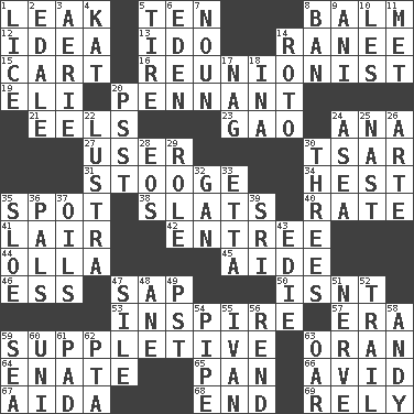 ACROSS 1. Path through which fluid escapes 5. "___ Little Indians" 8. Lip ointment 12. The main thing one is thinking about 13. Wedding promise 14. The wife of a rajah (variant) 15. Heavy open wagon 16. One who advocates reunion 19. Biblical high priest 20. Pre-World Series prize 21. Snakelike fish 23. E Mali city 24. Santa ___, CA 27. One who makes use of a thing 30. Russian ruler of old 31. Moe Howard, for one 34. Behest 35. Blemish 38. Narrow boards 40. Assign a rank or rating to 41. Den 42. Main course 44. Spanish pot 45. Assistant 46. Curvy letter 47. Plant excrement 50. Is not 53. Heighten or intensify 57. Epoch 59. Supplementary 63. Northwest Algerian city 64. Maternal 65. Baking dish 66. Enthusiastic 67. Opera by Verdi 68. Conclude 69. Trust DOWN 1. Louse (plural) 2. Peak District village in England 3. Nest on high 4. Krazy ___ of comics 5. Hoop that covers a wheel 6. Paradise 7. Part of speech 8. Forbid 9. Black tropical American cuckoo 10. French article 11. Was introduced to 14. Printing process, for short 17. Tired old horse 18. _ tizzy (2 wds.) 20. Inconspicuous attention getter 22. A period of five years 24. Toward the sea 25. Political cartoonist Thomas 26. Johnson of "Laugh-In" 28. Greek goddess of the dawn 29. Hero or heavy, e.g. 30. Threesomes 32. Separate the seeds from cotton 33. Singer James 35. A type of plum 36. Friends 37. Petroleums 39. _ Lanka 43. Singer Brickell 47. Filth; sediment 48. A saturated hydrocarbon 49. Pacific Standard Time (abbr.) 51. Impudent aggressiveness 52. Hang back 54. Corncob 55. _ the terrible 56. Tear apart 58. "60 Minutes" Commentator Rooney 59. Ocean 60. University (slang) 61. Writing tablet 62. Parent Teacher Association (abbr.) 63. Boat paddle