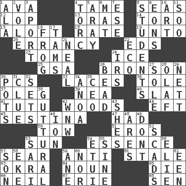 ACROSS 1. Actress Gardner 4. Not wild 8. Oceans 12. Chop off 13. Mouths or openings 14. "Corrida" creature 15. At or to great height 18. Assign a rank or rating to 19. To (old English) 20. Tendancy to err 22. Begley and Asner 23. Heavy book 24. Frozen water 25. Girls' org. (abbr.) 26. "Death Wish" actor 30. Personal Computers (abbr.) 33. Shoestrings 36. Lacquered or enameled metalware 37. Cassini of fashion 39. Teachers' org. 40. Narrow board 41. Ballerina skirt 42. Forest 44. Lizard (obsolete) 45. French poetic form 47. Possessed 50. Pull behind 51. Greek god of love 53. Player for Phoenix 54. Gist 57. Wither 59. Opposed to 61. Lacking originality or spontaneity 63. Gumbo ingredient 64. Part of speech 65. Expire 66. Famous astronaut Armstrong 67. 4th largest of the Great Lakes 68. Elected rep. DOWN 1. Wing 2. Short-tailed, large-bodied rat 3. To the left, to Queeg 4. Torque (variant) 5. Like ___ of sunshine 6. Floor covering 7. Compass dir. 8. SAT takers 9. Immeasurably long periods of time 10. Tate display 11. "Barney Miller" actor Jack 16. Toadlike animal 17. Scottish caps 21. Actress Patricia 22. Environmental prefix 24. Big collection agency 26. Necklace unit 27. Not divided or shared with others 28. Norwegian king 29. Remaining after all deductions 30. Plant holders 31. A slight indication 32. Arranges properly for use 34. Small Philippine buffalo 35. Corporate head (abbr.) 38. From the throat 42. Compass dir. 43. "______ My Girl" (Turtles hit) 46. Electrically charged atom 48. Ancient Greek god of war 49. Do not 52. Tons 53. Indian skirt 54. Needle holder 55. Trig term 56. Writer Wiesel 57. Boy, to dad 58. Supplement with great effort 59. One (Scot) 60. Or not 62. Car or cant ending