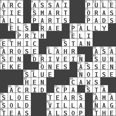 ACROSS 1. Curve 4. Slender Brazilian palm 9. Whine 13. Make a knot 14. Don Adams' spy role 15. Mouths or openings 16. Everything 17. Actors' quests 18. Writing tablets 19. Raised railways 21. Actress Charlotte 22. Friendly 24. Demure 26. Biblical high priest 27. Value system 29. Comedian Laurel of Laurel & Hardy 30. Came up 31. Cowardly lion portrayer 33. White ___ sheet 36. Elected rep. 37. Popular '50s hangout 40. Player for Phoenix 41. Make supply last 42. Washington bills 43. NE Netherlands city 45. Turn sharply 47. Annoying sound 48. Layer 49. Crow sounds 50. Bitter 52. Numbers guy (abbr.) 54. R.R. building 56. _ gin 57. Pulls into pieces 59. Nursemaid (var.) 61. Exchanged or delivered for money 62. Country estate 63. Tired old horse 64. Beverages made from leaves 65. Columnist Joseph or Stewart 66. Definite Article DOWN 1. "One Day ___ Time" 2. Cause heat under the collar 3. Portable communications device 4. Cleo's killer 5. Excessive but superficial compliments 6. "Two Mules for Sister ____" 7. Johnson of "Laugh-In" 8. ___ a Wonderful Life 9. Cotton for raincoats, e.g. 10. Mountain range 11. Kenny Rogers chart-topper in '80 12. Double-curved letter 20. Indian titles of respect 22. _ dish (used to culture cells) 23. Wing 25. On the rocks 27. Relaxation 28. Long journey 29. "______ My Girl" (Turtles hit) 31. Actor's bit 32. "___ Maria" 33. Helper 34. Takes to court 35. Singer Murray 38. Single shot of ammunition 39. Nanny 44. Sty mamas 45. Tears up 46. Flowery wreath 49. Monte _, Las Vegas Hotel/Casino 50. _ vera 51. Root beer relative 52. To provide with a ceiling 53. Friends 55. Housemaid 56. Fast jet (abbr.) 57. Federal power corp. 58. Plant excrement 60. Grow older