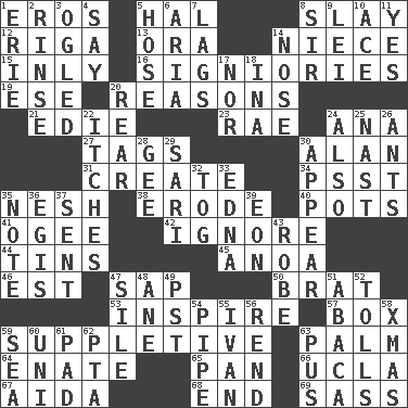 ACROSS 1. Greek god of love 5. Actor Linden 8. Kill 12. Capital of Latvia 13. Mouth or opening 14. Sibling's daughter 15. Inwardly 16. Seigniories (variant) 19. Compass dir. 20. Thinks logically 21. Singer Brickell 23. Actress Charlotte 24. Santa ___, CA 27. Labels 30. ____ Jay Lerner 31. Cause to be 34. Inconspicuous attention getter 35. Soft 38. Eat (away) 40. Plant holders 41. Double curve, resembling the letter S 42. Fail to notice 44. Metal containers 45. Small Philippine buffalo 46. Eastern Standard Time (abbr.) 47. Plant excrement 50. Naughty child 53. Motivate 57. Gift holder 59. Supplying deficiencies 63. Inside of hand 64. Maternal 65. Baking dish 66. Southern CA. univ. 67. Opera by Verdi 68. Conclude 69. Backtalk DOWN 1. One of the Great Lakes 2. Remove soap 3. Stared at amorously 4. Declare 5. Flexible conduit 6. Operatic vocal solo 7. Fails to keep up a pace 8. Title for a knight 9. Flowery wreath 10. Adept person 11. It is so 14. Sense of smell 17. And not 18. _ tizzy (2 wds.) 20. Stern 22. Strong, restless desires 24. In addition 25. Political cartoonist Thomas 26. Pismires 28. Turn to the right 29. Indian skirt 30. Become visible 32. Coat; cloak 33. Pulitzer Prize-winning author Ferber 35. Brief written record 36. Armor plate that protects the chest 37. Posted 39. A really long time 43. Loose flowing garment 47. Filth; sediment 48. A saturated hydrocarbon 49. Pacific Standard Time (abbr.) 51. Phillipine bananalike plant 52. For Whom the Bell _____ 54. Corncob 55. _ the terrible 56. Tear apart 58. Dec. holiday 59. Ocean 60. University (slang) 61. Groovy apt. 62. Parent Teacher Assoc. 63. Ichor