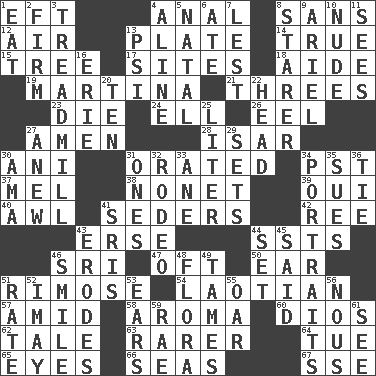 ACROSS 1. Newt 4. Of or related to the anus 8. Without 12. Atmosphere 13. Food holder 14. Loyal 15. Family _ (genealogy) 17. Locates 18. Assistant 19. Chrissie's court nemesis 21. Threesomes 23. Expire 24. Pipe bend 26. Snakelike fish 27. So be it 28. Austrian river, tributary to the Danube 30. Cuckoo 31. Spoke pompously 34. Pacific Standard Time (abbr.) 37. Cartoonist voice _ Blanc 38. Music written for nine 39. Fr. "Yes" 40. Leather borer 41. Spring feasts 42. To sift 43. Celtic language 44. Fast planes 46. Indian title of respect (Mr.) 47. Often (poetically) 50. Hearing organ 51. Full of chinks, cracks, or crevices 54. Of or relating to Laos or its people 57. Among 58. Odor 60. "Vaya con ____" 62. Lie 63. More valued for its uncommonness 64. Third day of the wk. 65. Snake ____ (dice throw) 66. Oceans 67. Compass dir. DOWN 1. Erode 2. Securely fixed in place 3. Excercise machine 4. Place in a line 5. Relating to or accompanying birth 6. Had dinner 7. For fear that 8. A viewer who gazes fixedly 9. Satellite of Uranus 10. Naked 11. Observes 13. Air pressure measure (abbr.) 16. 4th largest of the Great Lakes 20. Nine, plus one 22. Froth on beer 25. 61 cubic inches 27. Afresh 29. Arranges properly for use 30. Nursemaid (var.) 31. Washington bills 32. Cowboy competition 33. One (Scot) 34. Likenesses of persons 35. Institutes legal proceedings 36. Neckwear 41. Indian titles of respect 43. Eats (away) 44. Arrange properly for use 45. Alleged 46. Grin 48. Plants 49. Corrects by punishment or discipline 51. Assign a rank or rating to 52. "If ____ say so..." 53. Hearing organs 55. Rowing implement 56. Horse sense 59. Actress Charlotte 61. Perceive with the eye