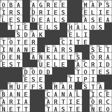 ACROSS 1. Chief or king in Benin or Nigeria 4. Match 9. Atlas contents 13. Big collection agency 14. Frees from moisture 15. Writer Wiesel 16. French article 17. Allots cards 18. At sea 19. Standoff 21. Raised railways 22. Saint headwear 24. Neighbor of Neb. 26. Connecticut Ivy Leaguer 27. Carrier 29. Quote 30. Empty; void 31. Hearing organs 33. Put into a specified state 36. Lair 37. Short socks 40. Mouth or opening 41. Eastern Standard Time (abbr.) 42. Ubangi River tributary 43. Sour-tasting 45. Texas town _ City 47. Lugs 48. Compass dir. 49. Native american tent (variation) 50. Performs or handles clumsily 52. Third mo. 54. R.R. building 56. Object of repulsion 57. Lessep's creation 59. Frozen water 61. Operatic vocal solo 62. Nick name for Arthur 63. The grampus (Milton) 64. Remaining after all deductions 65. Clothes sense 66. Modern: prefix DOWN 1. Petroleum 2. Cy Young winner Saberhagen 3. Aide 4. Say or write further 5. Of Greece 6. Monetary unit of Yemen 7. Snakelike fish 8. Curvy letter 9. Ear of corn 10. In addition 11. Sliced desserts 12. Ocean 20. Paradise 22. Robbery 23. The first octave above the treble staff 25. Length times width 27. Periodic rise and fall of the sea level 28. Singles 29. Algonquian 31. Supplemented with great effort 32. Everything 33. Making a chance decision by using lots 34. 4th largest of the Great Lakes 35. Bits 38. Unadorned figures 39. Suttee (variant) 44. 911 reaches them 45. Outscore 46. Order of Saint Francis (abbr.) 49. Distinguishing feature 50. Female horse 51. A single undivided whole 52. Hindu Mythology: god of death 53. Pismires 55. Land measure 56. Bar 57. Domesticated feline 58. Area sheltered from the wind 60. Environmental prefix