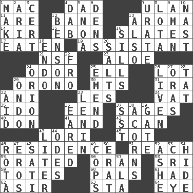 ACROSS 1. Big _ 4. Male parent 7. ____ Bator 11. "We ___ not amused" (Victoria) 12. Object of repulsion 13. Odor 14. Apertif with cassis 15. Inky black, to poets 16. Chalkboards 17. Consumed 19. Helper 21. Overdraft (abbr.) 23. _ vera 24. Aroma 25. Pipe bend 26. Car dealer's back yard 29. U. of Maine site 30. Mountains (abbr.) 31. Retirement account (abbr.) 32. Cuckoo 33. French article 34. Large container 35. Wedding promise 36. Car or cant ending 37. Gurus 40. Spanish title 41. Also 42. Glance over 43. Australian parrot (variant) 45. Small child 46. Dwelling 51. Arrive at 55. Declaimed 56. NW Algerian seaport 58. Indian title of respect (Mr.) 59. Hauls 60. Friends 61. Possessed 62. SW Saudi Arabia district 63. R.R. building 64. Sight organ DOWN 1. Cause to be 2. Operatic vocal solo 3. Foregone conclusion 4. Apply (a substance) by light strokes 5. Small Philippine buffalo 6. Habitations of wild animals 7. A salt of uric acid 8. Globular water bottle used in Asia 9. So be it 10. Political cartoonist Thomas 12. Gillaume's butler role 13. In addition 16. Beverly of Met fame 18. Inside; within (prefix) 20. Table seasonings 22. Away 24. Constellation of myth 25. Make improvements or corrections to 26. Make or become more lively 27. Mouths or openings 28. Make lace 29. Southwest Nigerian state 32. Help 33. Soviet premier 1918-24 36. Having ears or earlike features 37. Fast jet (abbr.) 38. Oak nuts 39. Yard entry 43. 61 cubic inches 44. Lyric poems 46. Round or rotation of duties 47. Greek god of love 48. Suttee (variant) 49. 911 reaches them 50. Part of Q.E.F. 52. American tennis player Robert 53. Supercomputer manufacturer 54. Flintstone garb 57. Chicken ___ king
