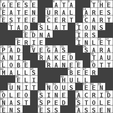 ACROSS 1. Honkers 6. "One Day ___ Time" 9. Definite Article 12. Eroded 13. Mountain range 14. Ancient Greek god of war 15. First name in cosmetics 16. Foregone conclusion 17. Heavy open wagon 18. Small amount or degree 19. Narrow board 20. Charged atoms 21. Pulitzer Prize-winning author Ferber 23. Big collection agency 24. One of the Great Lakes 25. An arm off of a larger body of water 28. Writing tablet 30. Viva Las _ 34. "Two Mules for Sister ____" 35. Black tropical American cuckoo 36. Swept the length of 38. The 19th letter of the Greek alphabet 39. Ear part 41. The wife of a rajah (variant) 43. Baseball player Mel 44. Promenades 46. Fermented drink made from hops 48. Connecticut Ivy Leaguer 49. Frame or body of a ship 50. A single undivided whole 51. Common sense 53. Car or cant ending 56. Margarine 57. Trig term 58. Bitter 60. Political cartoonist Thomas 61. Hurried 62. Fur scarf 63. Followers of ems 64. Double-curved letter 65. NE Netherlands city DOWN 1. Unit of force equal to gravity 2. 90 degrees 3. Singer James 4. Sowing specialist 5. Compass dir. 6. Length times width 7. Small pie 8. The first octave above the treble staff 9. Interpreter 10. Possessive pronoun 11. Eastern Standard Time (abbr.) 13. Southern CA. univ. 14. Oak nuts 19. Contemptuous expression 20. One more than two 22. HTML Container Element 24. The property of being fit to eat 26. Part of Q.E.F. 27. Strained 28. Inside of hand 29. Small Philippine buffalo 31. Slender fish 32. Alias (abbr.) 33. Elected rep. 37. To get out of a bus 40. American author Paul (1891-1958) 42. Snakelike fish 45. Be seated 47. Opts 49. Became colored 50. ____ Bator 51. Cuts off 52. Washington bills 54. Greek god of love 55. The longest river in the world 56. Single 57. Compass dir. 58. White ___ sheet 59. Lair