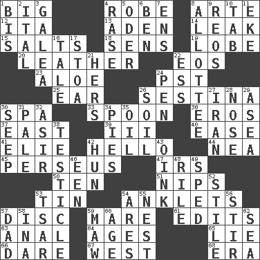 ACROSS 1. Massive 4. Loose flowing garment 8. Johnson of "Laugh-In" 12. Call ___ day 13. Arabian gulf 14. Path through which fluid escapes 15. Table seasonings 18. Elected reps. 19. Ear part 20. Cordwainer's material 22. Greek goddess of the dawn 23. _ vera 24. Pacific Standard Time (abbr.) 25. Ewer handle 26. French poetic form 30. Health resort 33. Soup utensil 36. Greek god of love 37. Compass direction 39. One more than two 40. Relaxation 41. Writer Wiesel 42. Phone greeting 44. Teachers' org. 45. Son of Zeus who helped slay Medusa 47. Big collection agency 50. Nine, plus one 51. Pinches, bites 53. Metal container 54. Short socks 57. Flat circle 59. Female horse 61. Prepares for publication 63. Of or related to the anus 64. Matures 65. Untruth 66. Have the gumption 67. 270 degrees 68. Epoch DOWN 1. Altar cloth linen 2. Slanted text style (abbr.) 3. An organ shaped like a helmet 4. Raze (variant) 5. River in Europe 6. Benjamin's nick name 7. Followers of ems 8. One to whom something is allotted 9. Vintage cars 10. Keyboard key 11. Supplement with great effort 16. Story 17. Portico 21. Possessive pronoun 22. Double-curved letter 24. Animal enclosure 26. The visible part of the earth's surface 27. SW Asia republic 28. Olfactory organ 29. Toward the sea 30. Ooze 31. Light colored 32. SW Saudi Arabia district 34. Sliced desserts 35. Lubricate 38. One of the two male reproductive glands 42. Attila the _ 43. Pig sound 46. Car or cant ending 48. Cause heat under the collar 49. Moved rapidly 52. Vertical member of a panel or frame 53. Russian ruler of old 54. Ancient Greek god of war 55. Egg locale 56. Disorderly outburst 57. Male parent 58. _ tizzy (2 wds.) 59. Informal term for the mouth 60. Grow older 62. Ocean
