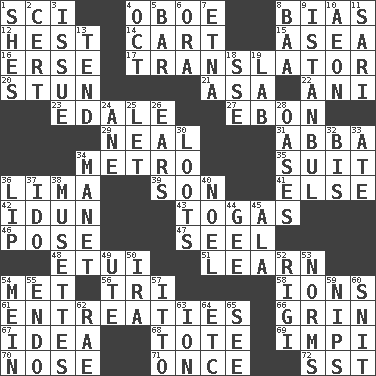 ACROSS 1. _-fi 4. Mitch Miller's instrument 8. Prejudice 12. Command 14. Draw slowly or heavily 15. Toward the sea 16. Celtic language 17. Interpreter 20. Surprise greatly 21. White ___ sheet 22. Black tropical American cuckoo 23. Peak District village in England 27. Inky black, to poets 29. Actress Patricia 31. Swedish rock group 34. Paris' subway 35. Set or collection 36. Pale green bean 39. Male offspring 41. Otherwise 42. Goddess of spring and wife of Bragi 43. Ancient Roman robes 46. Introduce or present, as a question 47. Stitch closed the eyes of (a falcon) 48. Needle holder 51. Acquire or gain knowledge or skills 54. Was introduced to 56. Three (prefix) 58. Charged atoms 61. Pleas 66. Amused look 67. It may be bright or harebrained 68. Haul 69. Body of Kaffir warriors 70. Sense of smell 71. At one time in the past 72. Fast jet (abbr.) DOWN 1. "______ My Girl" (Turtles hit) 2. Sure thing 3. Come out of 4. Sep. follower 5. Long, evenly shaped piece 6. Mouth or opening 7. Inactive volcano in Sicily 8. Sound made by sheep 9. Byzantium, centuries later 10. A really long time 11. Indian skirt 13. Be inclined (to) 18. Compass dir. 19. Experiment locale 24. One (Scot) 25. Allow 26. Hearing organs 28. Fertile tracts in a desert 30. Plunders 32. Altar cloth linen 33. Had dinner 34. French painter Edouard 36. Mouth edge 37. Wedding promise 38. French bagpipes 40. Christmas carol 44. Unit of force equal to gravity 45. In the manner of 49. Shoshoni 50. Retirement account (abbr.) 52. Swiss mountan, "Queen of the Mountains" 53. Typical models 54. Count _ (2 wds.) 55. Inside; within (prefix) 57. "Tell ____ the Marines!" 59. Pinches, bites 60. In a ____ (agitated or irritated) 62. Actress Charlotte 63. Electrically charged atom 64. And so on (abbr.) 65. Observe