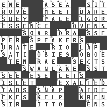 ACROSS 1. Compass dir. 4. At sea 8. Be seated 11. Be footloose 13. Confront 14. Have the gumption 15. Chop _ 16. Light colored 17. Composer Stravinsky 18. Substance 21. Baking chambers 22. Fly high 23. Mouth or opening 25. Compass dir. 26. For each 29. Orators 32. A salt of uric acid 34. River (Sp.) 35. Infant locale 38. Suttee (variant) 39. Off-Broadway awards 41. Mitch Miller's instrument 43. Nine, plus one 44. Actress Charlotte 45. Religious groups 46. Tchaikovsky ballet 50. Fast jet (abbr.) 51. Observe 54. Compass dir. 55. Allows 57. Small island 59. Glorified 63. Bits 64. Fastener 67. Assistant 68. Makes supply last 69. Seaweed 70. Songbird 71. Title for a knight 72. "Tell ____ the Marines!" 73. Followers of ems DOWN 1. Celtic language 2. Horse sense 3. Nights before holidays 4. Electrical Unit 5. Ocean 6. Snakelike fish 7. Had dinner 8. Gurus 9. Removes the wrinkles 10. Laconic 12. Snake ____ (dice throw) 14. HTML Container Element 19. Olfactory organ 20. Head covering 21. Rowing implement 23. Migrant worker of the '30s 24. Vintage cars 26. Fluid product of inflammation 27. Part of Q.E.F. 28. Assign a rank or rating to 30. Satellite of Uranus 31. A type of plum 33. Metal containers 36. Lettered men learn these first 37. Cooking vessels 39. Mouths or openings 40. Object of repulsion 42. Eastern Standard Time (abbr.) 45. Stalk of a moss capsule 47. Dripping 48. City in Syria 49. Dry husk or covering 51. Locates 52. 1973 Nobel Price Winner (Physics) Leo 53. A person who is older than you are 56. Cole _ (cabbage dish) 58. Curvy letter 60. Become fatigued 61. Genesis locale 62. Lairs 64. What Jean-Claude Killy likes to do 65. Fish or hair follower 66. The first octave above the treble staff