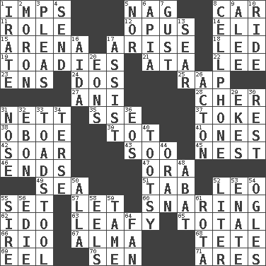 ACROSS 1. Naughty children 5. Tired old horse 8. Auto 11. Hero or heavy, e.g. 12. Musical composition 14. Biblical high priest 15. Sports stadium 17. Originate 18. Directed 19. Sycophants 21. _ moment's notice (2 wds.) 22. Area sheltered from the wind 23. Followers of ems 24. Two (Sp.) 25. Strike 27. Black tropical American cuckoo 28. "Mermaids" star 31. Remaining after all deductions 35. Compass dir. 37. Puff or smoke 38. Mitch Miller's instrument 39. Small child 41. Singles 42. Fly high 43. "Barney Miller" actor Jack 45. A home for chicks 46. Extremities 47. Mouth or opening 49. Ocean 51. Bar bill 52. Lion 55. Arrange properly for use 57. Allow 60. Catching in a trap 62. Wedding promise 63. Like summer trees 65. Add up to 66. River (Sp.) 67. _ mater 68. Wig 69. Snakelike fish 70. Elected rep. 71. Ancient Greek god of war DOWN 1. Feeling or showing extreme anger 2. Person of subnormal intelligence 3. Entreaties 4. Transmit 5. Not either 6. Capital of Western Samoa 7. Abrupt rush of wind 8. Portable communications device 9. Toward shelter 10. Travel on or in a vehicle 13. Dry up 16. Opera by Verdi 17. Aid 20. Immeasurably long periods of time 26. 13-14th century defensive garment 29. Makes supply last 30. Respite 31. Olfactory organ 32. Inky black, to poets 33. Inedible or poisonous agaric 34. Laconic 36. Greek goddess of the dawn 40. A girl or young woman (variant) 44. Northwest Algerian city 48. Blind as ____ 50. Silent film actress Nazimova 52. 61 cubic inches 53. Maternal 54. Stares 55. Male parent of an animal 56. Singer Brickell 58. Snakelike fish 59. Not wild 61. Roll call or roster of names 64. Avid follower