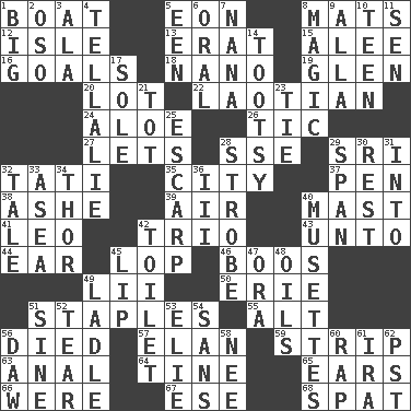 ACROSS 1. Water vessel 5. Period of immesurable duration 8. Floor coverings 12. Capri or Wright 13. Part of Q.E.F. 15. Toward shelter 16. Finish lines 18. Billionth: prefix 19. Small, secluded valley 20. Car dealer's back yard 22. Of or relating to Laos or its people 24. _ vera 26. Nervous spasm 27. Allows 28. Compass dir. 29. Indian title of respect (Mr.) 32. Jacques of French films 35. Municipality 37. Fenced enclosure 38. American tennis player Robert 39. Atmosphere 40. Vertical spar for supporting sails 41. Lion 42. Musical group of three 43. To (old English) 44. Hearing organ 45. Trim (branches) 46. Expressions of contempt or scorn 49. Cards in a Roman deck? 50. 4th largest of the Great Lakes 51. Paper fasteners 55. Keyboard modifier key 56. Passed on 57. Style 59. Long narrow piece of something 63. Of or related to the anus 64. Prong on a fork 65. Hearing organs 66. Past tense of be (plural) 67. Compass dir. 68. Petty quarrel DOWN 1. Of large size 2. Bear (Spanish) 3. Chicken ___ king 4. Copy Pinocchio 5. Car or cant ending 6. Relating to the mouth 7. Nanny 8. Mysterious quality of enchantment 9. Silent film actress Nazimova 10. Adolescent 11. Elected rep. 14. Tootsie (variant) 17. Not divided or shared with others 21. Small child 23. Make a knot 25. Fortification 28. Disco prop 29. Connect, as a bridge 30. State of inaction 31. To the inside or interior of 32. Falsehood 33. At sea 34. Son of Odin 36. One more than two 40. French bagpipes 42. Bathroom plumbing fixture 45. Mouth edge 47. Mouth or opening 48. Lubricates 49. Dipping utensil 51. Trig term 52. Pull into pieces 53. Writer Wiesel 54. Without 56. Simpleton 58. Born 60. Hit sharply and swiftly 61. Retirement account (abbr.) 62. Pacific Standard Time (abbr.)