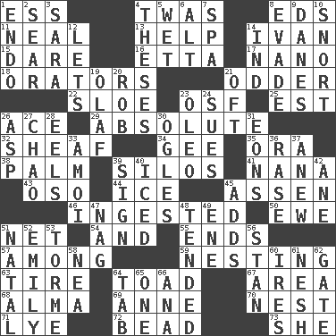 ACROSS 1. Curvy letter 4. It was, poetically 8. Begley and Asner 11. Anneal 13. Assist 14. _ the terrible 15. Have the gumption 16. Singer James 17. Billionth: prefix 18. Speakers 21. More peculiar 22. _ gin 23. Order of Saint Francis (abbr.) 25. Eastern Standard Time (abbr.) 26. Adept person 29. Utter; complete 32. Bundle of cut stalks of grain 34. Turn to the right 35. Mouth or opening 38. Inside of hand 39. Grain storage towers 41. Grandmother 43. Bear (Spanish) 44. Frozen water 45. NE Netherlands city 46. Eaten 50. She-sheep 51. Fish or hair follower 54. Plus 55. Extremities 57. Amid 59. Inhabiting a nest 63. Hoop that covers a wheel 64. Frog relative 67. Type of rug 68. _ mater 69. Queen of England 1702-14 70. A home for chicks 71. Potassium hydroxide 72. Necklace unit 73. A female animal or person DOWN 1. Inside; within (prefix) 2. Dry up 3. "Two Mules for Sister ____" 4. College papers 5. Soggy 6. The first octave above the treble staff 7. Health resort 8. Dodge 9. Natives or inhabitants of Denmark 10. Derisive sound 12. Allows 14. Working for oneself (abbr.) 19. Norwegian king 20. Director Reiner 21. Often (poetically) 23. Margarine 24. Institutes legal proceedings 26. Viper 27. US Secretary of Labor Elaine L. _ 28. Snakelike fish 30. Stares 31. Immeasurably long periods of time 33. Mine, in Marseilles 36. Raze (variant) 37. Afresh 39. Attach a signature 40. On the rocks 42. A saturated hydrocarbon 45. Does sums 47. Tired old horse 48. Watched over 49. Compass dir. 51. Brizilian seaport 52. Poet Dickinson 53. Singer Mel 56. Comedian Laurel of Laurel & Hardy 58. Teachers' org. 60. Angers 61. Tender 62. Yard entry 64. Keyboard key 65. Single 66. Santa ___, CA
