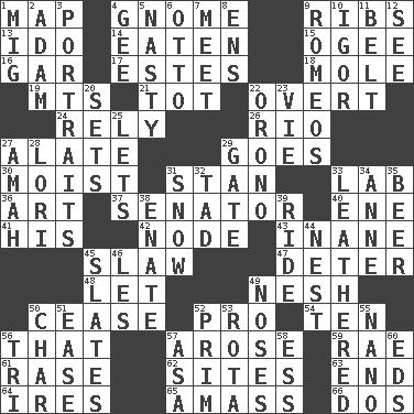 ACROSS 1. Atlas unit 4. Dwarf 9. Chest bones 13. Wedding promise 14. Consumed 15. Double curve, resembling the letter S 16. Slender fish 17. _____ Park, CO 18. Undercover agent 19. Mountains (abbr.) 21. Small child 22. Unconcealed 24. Have confidence or faith in 26. _ de Janeiro 27. Having winglike extensions 29. Leaves 30. Damp 31. Comedian Laurel of Laurel & Hardy 33. Experiment locale 36. Tate display 37. Legislator 40. Compass dir. 41. Part of HMS, perhaps 42. Thickened enlargement 43. Lacking in sense or substance 45. Cole _ (cabbage dish) 47. Prevent from occurring 48. Allow 49. Delicate 50. Desist 52. Adept person 54. Nine, plus one 56. Not this but _ 57. Came up 59. Actress Charlotte 61. To erase 62. Settings 63. Conclusion 64. Angers 65. Collect or gather 66. Two (Sp.) DOWN 1. Russian fighter aircraft 2. First man 3. Likenesses of persons 4. Unit of force equal to gravity 5. Characterized by obscenity 6. Von Bismarck 7. Confront 8. Followers of ems 9. Lover boys 10. Russian composer Stravinsky 11. Waist strap 12. Observe 20. Arranges properly for use 22. U. of Maine site 23. Compete 25. Allows 27. Wet nurse 28. Australian parrot (variant) 29. Yard entry 31. Frozen precipitation 32. Small boy 33. Tough but pliablecoriaceous 34. Queen of England 1702-14 35. Fermented drink made from hops 38. Related on the mother's side 39. Travel on an animal 44. A home for chicks 45. Chalkboards 46. French article 49. Olfactory organs 50. Burn to charcoal 51. Comfort 52. Demure 53. Roll call or roster of names 55. Billionth: prefix 56. Three (prefix) 57. White ___ sheet 58. Curvy letter 60. Begley and Asner