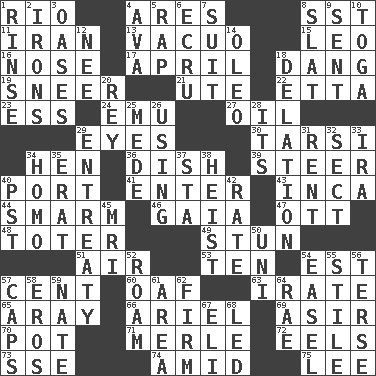 ACROSS 1. _ de Janeiro 4. Ancient Greek god of war 8. Fast jet (abbr.) 11. SW Asia republic 13. In a vacuum (with "in") 15. Lion 16. Sense of smell 17. Showery time 18. Mild oath, euphamism for damn 19. Contemptuous expression 21. Shoshoni 22. Singer James 23. Double-curved letter 24. Australian flightless bird 27. Petroleum 29. Sight organs 30. Tarsus (plural) 34. Layer 36. Food container 39. Guide 40. Left side of a ship or aircraft 41. Keyboard key 43. South American Indian 44. Excessive but superficial compliments 46. Greek goddess of the earth (variant) 47. Baseball player Mel 48. Carrier 49. Make senseless or dizzy 51. Atmosphere 53. "___ Little Indians" 54. Eastern Standard Time (abbr.) 57. Penny 60. Clumsy lout 63. Feeling or showing extreme anger 65. Like ___ of sunshine 66. Satellite of Uranus 69. SW Saudi Arabia district 70. Cooking vessel 71. Haggard of country music 72. Snakelike fish 73. Compass dir. 74. Among 75. Area sheltered from the wind DOWN 1. Wash lightly 2. Metal shackles 3. Fertile tracts in a desert 4. Actress Gardner 5. Strike 6. Shade of tan 7. Costume for a special activity 8. Narrow board 9. Transmitted 10. Ancient Roman robe 12. Born 14. Butter sub 18. Conveyance 20. Marina Del _, California 25. Ancient Persian 26. Exploiting 28. ___ a Wonderful Life 29. Plea 31. Monthly bill 32. Religious group 33. Lyricist Gershwin 34. Same (prefix) 35. Part of Q.E.F. 37. R.R. building 38. Robbery 40. Pacific Standard Time (abbr.) 42. Assign a rank or rating to 45. Medical imaging device (abbr.) 50. Corn or form start 52. Wander 54. Artist's stand 55. Vertical member of a panel or frame 56. Laconic 57. Balmoral and tarboosh 58. Greek god of love 59. Nathan's nickname 61. Type of rug 62. Become taut 64. Actress Charlotte 67. Connecticut Ivy Leaguer 68. Directed