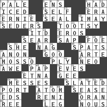 ACROSS 1. Light colored 5. Followers of ems 8. Possessed 11. On the rocks 12. Automatically 14. Period 15. Bert's buddy 17. Lick closed 18. "If ____ say so..." 19. Spring feasts 21. A girl or young woman (variant) 23. It would 25. Greek god of love 26. Dry up 27. Plant excrement 28. Enemy 31. A female animal or person 33. Tired old horse 35. Arguments over trivial matters 37. Soon (poet.) 38. Thick or sticky substance 40. Johnson of "Laugh-In" 41. With motion or animation 43. Apply oneself diligently 45. Modern: prefix 46. Deep reverence 47. Infant food 50. Nights before holidays 52. Inactive volcano in Sicily 53. Unit of force equal to gravity 54. Makes clutter 56. Scheduled 61. Left side of a ship or aircraft 62. Smallest unit of an element 65. Gospel singer Marvin 66. Begley and Asner 67. Painter Guido (1575-1642) 68. NW Algerian seaport 69. To riddle 70. Part of a journey 71. Good sense DOWN 1. Sliced desserts 2. 43,560 square feet 3. Grant temporary use of 4. Singer Brickell 5. Double-curved letter 6. Born 7. Chalkboards 8. Cloth borders 9. Like ___ of sunshine 10. 24 hours 13. Plants 16. 4th largest of the Great Lakes 18. It is 20. Comedian Laurel of Laurel & Hardy 22. I made a mistake 24. To draw with force 26. Elected reps. 28. Conductor's collection 29. "Beetle Bailey" pooch 30. Compass dir. 31. Frozen precipitation 32. Stockings 34. Grand Old Party 36. Baking dishes 37. Wet nurse (var.) 39. Cassini of fashion 42. Elects 44. Jacques Cousteau's middle name 48. Approach 49. Soft color 51. Snakelike fish 52. Eastern Standard Time (abbr.) 54. Method 55. Celtic language 57. Period of immesurable duration 58. Pacific island yam 59. He sold his birthright 60. Habitations of wild animals 61. For each 63. Single 64. Russian fighter aircraft