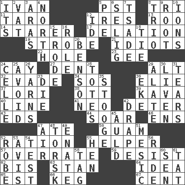 ACROSS 1. _ the terrible 5. Pacific Standard Time (abbr.) 8. Three (prefix) 11. Edible starchy tuberous root 12. Angers 13. Friend of Pooh 14. A viewer who gazes fixedly 17. Conveyance 19. Disco prop 21. Foolish or stupid persons 22. Opening into or through something 23. Turn to the right 24. Island 27. Scratch 29. The first octave above the treble staff 32. Dodge 34. Distress signal 36. Writer Wiesel 37. Australian parrot (variant) 38. Baseball player Mel 39. Polynesian shrub of the pepper family 40. Actor's bit 41. Modern: prefix 42. Prevent from occurring 43. Begley and Asner 44. Fly high 46. Followers of ems 47. Had dinner 50. Island territory of the United States 52. Food allowance for one day 55. Assistant 57. Make much ado about nothing 59. Stop 62. Twice 63. Comedian Laurel of Laurel & Hardy 64. The content of cognition 65. Eastern Standard Time (abbr.) 66. Barrel 67. Penny DOWN 1. It is 2. Large container 3. Ancient river in northeast Turkey 4. 0 degrees 5. Before (prefix) 6. Major League Baseball Commissioner Bud 7. Sadhe (variant) 8. Musical group of three 9. Carrot, for example 10. Charged atoms 12. Binary compound 15. Eat (away) 16. Hero or heavy, e.g. 18. Make a knot 20. Gillaume's butler role 24. Cell (Danish) 25. Shun 26. Entertaining tales 28. Hauls 29. Having winglike extensions 30. Make or become more lively 31. Rends 33. Expire 35. Moe Howard, for one 36. Supplement with great effort 42. Window treatment 45. Old (Scot.) 47. Atmosphere 48. Cod relative 49. Related on the mother's side 51. Of or pertaining to a meson 52. Loose flowing garment 53. Advice 54. Trial 55. Layer 56. Travel on or in a vehicle 58. Label 60. Elected rep. 61. Make lace