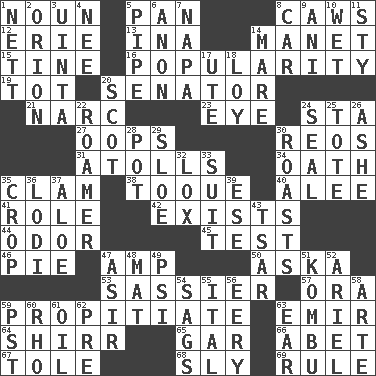 ACROSS 1. Part of speech 5. Baking dish 8. Crow sounds 12. One of the Great Lakes 13. _ tizzy (2 wds.) 14. French painter Edouard 15. Prong on a fork 16. Teen's desire 19. Small child 20. Elected representative 21. Drug cop 23. Sight organ 24. R.R. building 27. I made a mistake 30. Vintage cars 31. Ringlike coral islands and reefs 34. Pledge 35. Burrowing marine mollusk 38. Woman's close-fitting hat 40. Toward shelter 41. Hero or heavy, e.g. 42. Is extant 44. Aroma 45. Trial 46. Sliced dessert 47. Electrical Unit 50. "____ silly question..." 53. More impudent 57. Mouth or opening 59. Appease 63. Independent ruler or chieftain 64. Bake eggs in their shells 65. Slender fish 66. Collude with 67. Lacquered or enameled metalware 68. Stealthy 69. General guideline DOWN 1. Remaining after all deductions 2. Constellation of myth 3. National forest in Provo, Utah 4. Born 5. Corncob 6. Soon (poet.) 7. California wine valley 8. Automobile 9. Black tropical American cuckoo 10. Dripping 11. Filthy place 14. Female horse 17. Shoshoni 18. Myrna of the movies 20. Highlander 22. Wanderer 24. Lick closed 25. Haul 26. American tennis player Robert 28. Plant holder 29. _ gin 30. Ridicules or criticizes harshly 32. Brine-cured salmon 33. Costume for a special activity 35. Riding implement 36. Farming town in central California 37. Medicinal plant 39. Compass dir. 43. Russian ruler of old 47. SW Saudi Arabia district 48. Floor protector 49. Air pressure measure (abbr.) 51. Dried seaweed eaten as food 52. Satellite of Uranus 54. Sinks 55. Slanted text style (abbr.) 56. Suggestive of the supernatural 58. Johnson of "Laugh-In" 59. Pacific Standard Time (abbr.) 60. 17th letter of the Greek alphabet 61. Petroleum 62. Before (prefix) 63. Hearing organ