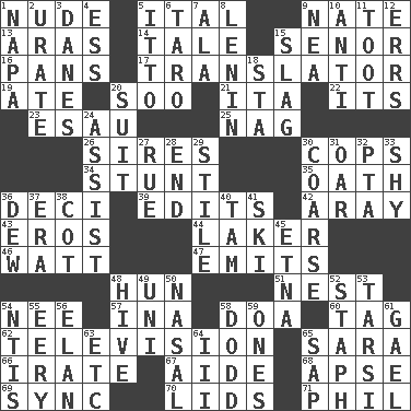 ACROSS 1. Naked 5. Slanted text style (abbr.) 9. Nathan's nickname 13. Ancient river in northeast Turkey 14. Lie 15. Sir (Sp.) 16. Zero-star reviews 17. Interpreter 19. Had dinner 20. "Barney Miller" actor Jack 21. Call ___ day 22. It is 23. He sold his birthright 25. Tired old horse 26. Begets 30. 911 reaches them 34. Difficult or unusual or dangerous feat 35. Pledge 36. Tenth: prefix 39. Prepares for publication 42. Like ___ of sunshine 43. Greek god of love 44. Member of a famous L.A. basketball team 46. Electrical Unit 47. Sends forth 48. Attila the _ 51. Egg locale 54. Born 57. _ tizzy (2 wds.) 58. ___ good deed 60. Label 62. Household entertainment appliance 65. "Two Mules for Sister ____" 66. Feeling or showing extreme anger 67. Assistant 68. Domed church section 69. Synchronize (abbr.) 70. Flaplike coverings 71. Silvers or Donahue DOWN 1. California wine valley 2. A salt of uric acid 3. Natives or inhabitants of Denmark 4. Double-curved letter 5. "Tell ____ the Marines!" 6. Pacific island yam 7. Insect wing 8. Soviet premier 1918-24 9. Teachers' org. 10. Against 11. A blast of a horn 12. Blunders 15. Volcanic refuse 18. R.R. building 20. Set of matching outer garments 24. Aid 27. Regret 28. Conclude 29. Vertical member of a panel or frame 30. Rough 31. Rowing implement 32. Parent Teacher Association (abbr.) 33. Like a shrinking violet 36. Morning condensation 37. Period 38. Small bed 40. Scottish cap 41. What Jean-Claude Killy likes to do 45. Inactive volcano in Sicily 48. Hub of activity 49. Single; one (prefix) 50. Rhinal 52. Staphylococcus 53. Tarsus (plural) 54. Nuclear Threat Initiatives 55. Suggestive of the supernatural 56. Style 58. Texas town _ City 59. Singles 61. Highlander 63. And so on (abbr.) 64. One more than two 65. Plant excrement