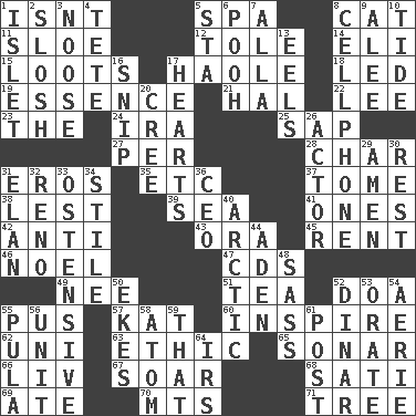ACROSS 1. Is not 5. Health resort 8. Domesticated feline 11. _ gin 12. Lacquered or enameled metalware 14. Biblical high priest 15. Plunders 17. White Person, in Hawaii 18. Directed 19. Core 21. Actor Linden 22. Area sheltered from the wind 23. Definite Article 24. Retirement account (abbr.) 25. Plant excrement 27. For each 28. Burn to charcoal 31. Greek god of love 35. And so on (abbr.) 37. Heavy book 38. For fear that 39. Ocean 41. Singles 42. Opposed to 43. Mouth or opening 45. Monthly bill 46. Christmas carol 47. Music discs 49. Born 51. Afternoon social gathering 52. ___ good deed 55. Suppuration 57. Krazy ___ of comics 60. Heighten or intensify 62. Corn or form start 63. Value system 65. Underwater navigation system 66. 54 in ancient Rome 67. Fly high 68. Suttee (variant) 69. Had dinner 70. Mountains (abbr.) 71. Relationship diagram DOWN 1. Small island 2. Splash clumsily 3. Trap for birds or small mammals 4. Wig 5. R.R. building 6. "Silly old bear" 7. Silent film actress Nazimova 8. Portable communications device 9. Toward shelter 10. Event that recurs at intervals 13. Snakelike fish 16. Clip 17. Centers of feelings and intuitions 20. Algonquian 26. Thespian 29. So be it 30. Take ten 31. Enthusiasm 32. Former U.S. Attorney General Janet 33. Clearly or manifestly demonstrative 34. Vertical member of a panel or frame 36. Corporate head (abbr.) 40. Northern region 44. An important port of Yemen 48. Backtalk 50. Makes supply last 52. Middle Eastern gold or silver currency 53. Declaim 54. Nest on high 55. Monetary unit of Botswana 56. A single undivided whole 58. Tiny particle 59. Not this but _ 61. Mail 64. Big collection agency