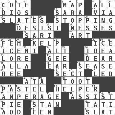 ACROSS 1. ____ d'Azur (French Riviera) 5. Atlas unit 8. Everything 11. "Vaya con ____" 12. "Two Mules for Sister ____" 13. By way of 14. Chalkboards 17. Discontinuing 19. Cease 21. Makes clutter 22. Indian skirt 23. Tate display 24. Opposite of masc. 27. Seaweed 29. Frozen water 32. Ancient Celtic tribe of eastern Britain 34. The first octave above the treble staff 36. The content of cognition 37. Old wives' tales, e.g. 38. Unit of force equal to gravity 39. Letter starter 40. Silent film actress Nazimova 41. Hearing organ 42. Gospel singer Marvin 43. To sift 44. Religious group 46. Directed 47. "One Day ___ Time" 50. A blast of a horn 52. Soft color 55. Assistant 57. Electrical Measurement 59. Aid 62. Sliced dessert 63. Comedian Laurel of Laurel & Hardy 64. Jacques of French films 65. Increase 66. Car or cant ending 67. Narrow board DOWN 1. Music discs 2. Petroleum 3. Frog relative 4. _____ Park, CO 5. Floor covering 6. Odor 7. Some stationery 8. Deliberation 9. Actor's bit 10. Straggles 12. Fast jet (abbr.) 15. 1973 Nobel Price Winner (Physics) Leo 16. Male parent of an animal 18. Pacific Standard Time (abbr.) 20. Fodder prepared in a silo 24. Having threads 25. Learning spot: Fr. 26. Haggard of country music 28. Entreaties 29. Perfect 30. Stop 31. Having ears or earlike features 33. Teachers' org. 35. Cigar-shaped 36. Binary compound 42. Ceases 45. Root beer relative 47. Had dinner 48. Laconic 49. Having winglike extensions 51. Trials 52. Dad 53. Among 54. Hurried 55. Layer 56. Monetary unit of Yemen 58. Separate the seeds from cotton 60. R.R. building 61. Teat (slang)