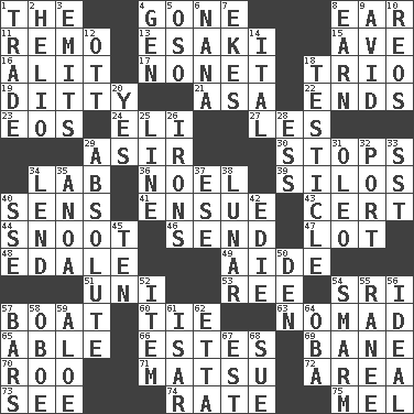 ACROSS 1. Definite Article 4. Went 8. Ewer handle 11. San ____ (Riviera town) 13. 1973 Nobel Price Winner (Physics) Leo 15. "___ Maria" 16. Set down 17. Music written for nine 18. Musical group of three 19. Simple song 21. White ___ sheet 22. Conclusions 23. Greek goddess of the dawn 24. Biblical high priest 27. French article 29. SW Saudi Arabia district 30. Constricts 34. Experiment locale 36. Christmas carol 39. Grain storage towers 40. Elected reps. 41. Follow as a consequence or result 43. Sure thing 44. Snout, nose 46. Post 47. Car dealer's back yard 48. Peak District village in England 49. Assistant 51. Corn or form start 53. To sift 54. Indian title of respect (Mr.) 57. Water vessel 60. Neckwear 63. Wanderer 65. Competent 66. _____ Park, CO 69. Object of repulsion 70. Friend of Pooh 71. Taiwanese island in East China Sea 72. Type of rug 73. Perceive with the eye 74. Pace 75. Cartoonist voice _ Blanc DOWN 1. Swap 2. Sun: prefix 3. Sends forth 4. Commissioned military rank (abbr.) 5. Bear (Spanish) 6. Grandmother 7. Supplements with great effort 8. Merit 9. Enthusiastic 10. Vintage cars 12. Baseball player Mel 14. Slanted text style (abbr.) 18. One of the two male reproductive glands 20. Consenting reply 25. Actor's bit 26. Metal shackles 28. Double-curved letter 29. Utter; complete 31. Margarine 32. Left side of a ship or aircraft 33. Fast jet (abbr.) 34. Grant temporary use of 35. Small Philippine buffalo 37. Compass dir. 38. Type of eclipse 40. Compass dir. 42. Singer Brickell 45. "___ Little Indians" 50. Lair 52. Detail 54. Excessive but superficial compliments 55. The wife of a rajah (variant) 56. Standard of perfection 57. Taverns 58. Mitch Miller's instrument 59. Medicinal plant 61. Austrian river, tributary to the Danube 62. Singer James 64. Chief or king in Benin or Nigeria 67. Eastern Standard Time (abbr.) 68. Institute legal proceedings