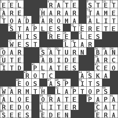 ACROSS 1. Snakelike fish 4. Pace 8. Proofreading order 12. "We ___ not amused" (Victoria) 13. Ethiopian city, capital of Harari 14. Docile 15. Frog relative 17. Scent 18. Came down and settled, as after flight 19. Paper fasteners 21. Cylindrical with tapered ends 23. Part of HMS, perhaps 24. To separate or throw off 26. French article 27. 270 degrees 28. One who doesn't tell the truth 30. Boat paddle 31. Titan orbits this 34. Forbid 37. Shoshoni 38. Remain 39. Curve 40. It would 41. Food holders 42. Corporate head (abbr.) 43. College mil. group 44. "____ silly question..." 46. Greek goddess of the dawn 47. Cleo's killer 50. ___ a Wonderful Life 51. Heat 54. Portable computers 57. Medicinal plant 58. Declaim 60. Dad 62. Redecorate 63. 61 cubic inches 64. Domesticated feline 65. Observes 66. Paradise 67. Period DOWN 1. Ingest 2. Greek god of love 3. Resembling or made to resemble leather 4. Less widely known 5. Came up 6. Scottish cap 7. Part of Q.E.F. 8. A viewer who gazes fixedly 9. Falsehoods 10. Give off 11. False hair 13. Actor Linden 16. Raised platform 20. Pacific Standard Time (abbr.) 22. Liveliness 25. Dodge 27. Electrical Unit 29. Angers 30. Fr. "Yes" 31. Table seasoning 32. Phillipine bananalike plant 33. Teat (slang) 34. Keyboard key 35. Length times width 36. Non-commissioned officer (abbr.) 41. Mail 43. Lover boys 44. Small island 45. Constrict 46. Wear away 48. Schedule 49. Eucharist need 51. Armed conflicts 52. Toward shelter 53. Opening into or through something 55. For each 56. Coast Guard woman 59. To free from 61. "One Day ___ Time"