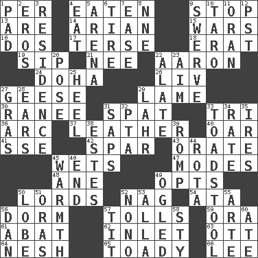 ACROSS 1. For each 4. Consumed 9. Close up, plug up 13. "We ___ not amused" (Victoria) 14. Believer in; advocate of (suffix) 15. Armed conflicts 16. Two (Sp.) 17. Laconic 18. Part of Q.E.F. 19. Small drink 21. Born 22. Composer Copland 24. Capital of the state of Qatar 26. 54 in ancient Rome 27. Honkers 29. Unable to walk 30. Indian princess (variant) 31. Argument over a trivial matter 33. Three (prefix) 36. Curve 37. Cordwainer's material 40. Rowing implement 41. Compass dir. 42. Coast Guard woman 43. Speak pompously 45. Moistens 47. Methods 48. One (Scot) 49. Chooses 50. Domineers 52. Tired old horse 54. _ moment's notice (2 wds.) 56. Dormintory (informal) 57. For Whom the Bell _____ 59. Mouth or opening 61. Blind as ____ 62. An arm off of a larger body of water 63. Baseball player Mel 64. Soft 65. Sycophant 66. Area sheltered from the wind DOWN 1. Writing tablet 2. Greek god of love 3. Dwelling 4. Erode 5. Sports stadium 6. Hoop that covers a wheel 7. Relaxation 8. Compass dir. 9. Turn aside suddenly 10. Pacific island yam 11. Northwest Algerian city 12. Pacific Standard Time (abbr.) 20. Introduce or present, as a question 22. Having winglike extensions 23. Direct toward a target or goal 25. Person who is morally reprehensible 27. Pate de foie ____ 28. Hearing organs 29. Cowardly lion portrayer 31. Plant excrements 32. Parent Teacher Association (abbr.) 33. Inedible or poisonous agaric 34. Pace 35. Angers 38. _____ Park, CO 39. Frolic 44. Roll call or roster of names 45. Heat 46. Conclude 49. Stared 50. Ear part 51. Mouths or openings 52. Words to Nanette 53. Silent film actress Nazimova 55. Johnson of "Laugh-In" 56. Daniel's nick name 57. Teat (slang) 58. Filthy place 60. Had dinner