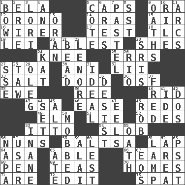 ACROSS 1. Actor Lugosi 5. Smile enhancers 9. Mouth or opening 12. U. of Maine site 14. Mouths or openings 15. Atmosphere 16. One who wires 17. Trial 18. Affectionate concern, for short 19. Flowery wreath 20. Most capable 23. "______ My Girl" (Turtles hit) 24. Leg joint 25. Blunders 27. Portico 30. Cuckoo 32. Cards in a Roman deck? 33. Table seasoning 34. Texas town _ City 36. Order of Saint Francis (abbr.) 38. She-sheep 39. Portuguese money of account (variant) 40. To free from 43. Girls' org. (abbr.) 46. Comfort 48. Make new 49. Shade tree 51. Whopper 52. Lyric poems 53. "Tell ____ the Marines!" 54. Messy guy 56. Religious women 58. Greek mezzo-soprano Agnes 61. Infant locale 64. White ___ sheet 65. Competent 66. Pulls apart 68. Animal enclosure 69. Beverages made from leaves 70. Dwellings 71. "We ___ not amused" (Victoria) 72. Prepare for publication 73. Argument over a trivial matter DOWN 1. Soup holder 2. 4th largest of the Great Lakes 3. Australian parrot (variant) 4. A saturated hydrocarbon 5. ____ d'Azur (French Riviera) 6. Ancient Greek god of war 7. Soft color 8. Fast jet (abbr.) 9. Curses 10. Cause heat under the collar 11. Arches 13. NW Algerian seaport 21. Necklace unit 22. Poe poem 23. Indian titles of respect 24. Krazy ___ of comics 26. River (Sp.) 27. Compass dir. 28. The 23rd letter of the Hebrew alphabet 29. Cassini of fashion 31. Perfect 35. Cease 37. Flintstone 41. Binary compound 42. Two (Sp.) 44. Puts into a specified state 45. The first octave above the treble staff 47. Snakelike fish 48. Director Reiner 50. Crowded into 53. Lacking in sense or substance 55. Pledge 56. California wine valley 57. One who uses or employs something 59. Jai _ 60. For fear that 61. Desk light 62. Length times width 63. Inconspicuous attention getter 65. Had dinner 67. Greek goddess of the dawn