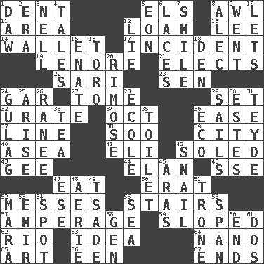 ACROSS 1. Gouge 5. Raised railways 8. Leather borer 11. Type of rug 12. Rich soil 13. Area sheltered from the wind 14. Place for singles 17. Happening 19. Poe poem 21. Opts 22. Indian skirt 23. Elected rep. 24. Slender fish 27. Heavy book 29. Arrange properly for use 32. A salt of uric acid 34. Sep. follower 36. Relaxation 37. Actor's bit 38. "Barney Miller" actor Jack 39. Municipality 40. At sea 41. Connecticut Ivy Leaguer 42. Having a sole or soles 43. Unit of force equal to gravity 44. Liveliness 46. Compass dir. 47. Ingest 50. Part of Q.E.F. 52. Makes clutter 55. Flight of steps 57. Electrical Measurement 59. Had an oblique or slanted direction 62. _ de Janeiro 63. It may be bright or harebrained 64. Billionth: prefix 65. Tate display 66. Car or cant ending 67. Conclusions DOWN 1. Simpleton 2. Period 3. 1994 drama film starring Jodie Foster 4. Stories 5. A really long time 6. Shoestrings 7. Grin 8. Actor Baldwin 9. Gone 10. Allows 12. Whopper 15. Maternal 16. "Corrida" creature 18. Lair 20. Full of chinks, cracks, or crevices 24. POW camp 25. Get up 26. Indian princess (variant) 28. Learning spot: Fr. 29. Moves on water 30. _____ Park, CO 31. Miss Universe 1986, Barbara Palacios _ 33. Afternoon social gathering 35. Bathroom 36. Environmental prefix 42. Slow-paced one 45. Caspian sea tributary 47. Compass dir. 48. Nest on high 49. Sadhe (variant) 51. Heavy duty weighing machine 52. Hindu Mythology: god of death 53. Independent ruler or chieftain 54. Specific locale 55. Ocean 56. Connect, as a bridge 58. Commissioned mil. rank 60. Conclusion 61. Two (Sp.)