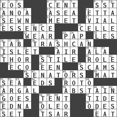 ACROSS 1. Greek goddess of the dawn 4. Penny 8. Fast jet (abbr.) 11. Small Philippine buffalo 13. Toward the sea 14. Singer James 15. Stitched 16. Rendezvous 17. Small bottle 18. Core 21. Cell (Danish) 22. Erode 23. Infant food 25. French article 26. Bar bill 29. File 13 32. Small island 34. Wind 35. Insect wing 38. Son of Odin 39. Vertical member of a panel or frame 41. Hero or heavy, e.g. 43. Environmental prefix 44. Car or cant ending 45. Fraudulent business schemes 46. Elected representatives 50. Floor covering 51. Ocean 54. Begley and Asner 55. Printing process, for short 57. Therefore, facetiously 59. Choose not to consume 63. Travels 64. Portable shelter 67. Event that recurs at intervals 68. Pulitzer Prize-winning author Ferber 69. Butter sub 70. Lyric poems 71. Put into a specified state 72. Russian ruler of old 73. Ingest DOWN 1. Relaxation 2. Singles 3. Sty mamas 4. Device for capturing images 5. Compass dir. 6. Born 7. Make lace 8. Not moving 9. Having lost freshness 10. Falsehoods 12. Afresh 14. First lady 19. Remaining after all deductions 20. Automobile 21. Tax preparer (abbr.) 23. Silvers or Donahue 24. Land measure 26. Teat (slang) 27. American tennis player Robert 28. Group of countries in special alliance 30. Inhabitant of Heaven 31. Drug cop 33. Greek god of love 36. Rich soil 37. _ mater 39. Transmit 40. Afternoon social gatherings 42. Eastern Standard Time (abbr.) 45. Fast planes 47. Snakelike fish 48. Speaker 49. Director Reiner 51. Gurus 52. Wear away 53. Rep 56. "Beetle Bailey" pooch 58. White ___ sheet 60. Assistant 61. The content of cognition 62. A home for chicks 64. Small child 65. Raised railways 66. Teachers' org.