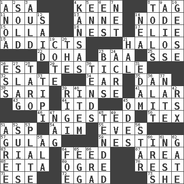 ACROSS 1. White ___ sheet 4. Peachy ____! 8. Label 11. Good sense 13. Queen of England 1702-14 14. Thickened enlargement 15. Spanish pot 16. A home for chicks 17. Writer Wiesel 18. Inveterate users 21. Auras 22. Capital of the state of Qatar 23. Sound made by sheep 25. Compass dir. 26. Eastern Standard Time (abbr.) 29. A testis 32. Schedule 34. Ewer handle 35. Daniel's nick name 38. Indian skirt 39. Wash lightly 41. Having or resembling wings 43. Republican Party 44. It would 45. Leaves out 46. Consumed 50. John Ritter's dad 51. Viper 54. Direct toward a target or goal 55. Nights before holidays 57. Russian prison camp 59. Snuggling 63. Monetary unit of Yemen 64. Nourish 67. Length times width 68. Singer James 69. Legendary monster 70. Remainder 71. Compass dir. 72. Mild oath 73. A female animal or person DOWN 1. Small Philippine buffalo 2. Exchanged or delivered for money 3. Old (Scot.) 4. Sunflower state 5. Compass dir. 6. Followers of ems 7. Fish or hair follower 8. For Whom the Bell _____ 9. Goodbye (Sp.) 10. Honkers 12. Alleged 14. Teachers' org. 19. ____ d'Azur (French Riviera) 20. Definite Article 21. Actor Linden 23. Prejudice 24. 1/640 square mile 26. Curvy letter 27. Volcanic refuse 28. Pacific island yam 30. Is inclined (to) 31. Dutch treat 33. Native american tent (variation) 36. Came down and settled, as after flight 37. Nathan's nickname 39. Swiss mountan, "Queen of the Mountains" 40. A whole individual unit 42. Acura sports coupe 45. Lyric poems 47. Tired old horse 48. Watched over 49. First lady 51. Match 52. Costumes for special activities 53. Food holder 56. Play the lead 58. According to 60. Angers 61. Delicate 62. Yard entry 64. Enemy 65. Ovum 66. Period