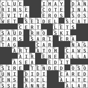 ACROSS 1. A slight indication 5. "If ____ say so..." 9. Daniel's nick name 12. Wash lightly 14. ____ d'Azur (French Riviera) 15. _ tizzy (2 wds.) 16. Webber/Rice musical 17. Greek god of love 18. Distress signal 19. Soggy 20. A glass for beer 23. Get outta here! 24. An absolute certainty 25. Allows 27. Saudi Arabian king (1953-1964) 30. 17th letter of the Greek alphabet 32. What Jean-Claude Killy likes to do 33. Hearing organs 34. Indian skirt 36. Epoch 38. Label 39. Automobile 40. Tired old horse 43. Tate display 46. Smallest unit of an element 48. Crow sounds 49. Wind 51. Compass dir. 52. Silent film actress Nazimova 53. At sea 54. Prepare for publication 56. Father 58. Looked after 61. Bear (Spanish) 64. Single; one (prefix) 65. "You Light Up My Life" star Conn 66. Having ears or earlike features 68. Followers of ems 69. Christmas carol 70. Having winglike extensions 71. Compass dir. 72. Singer Murray 73. Having or resembling wings DOWN 1. Ship's personnel 2. Moving, as bait 3. A single undivided whole 4. Eastern Standard Time (abbr.) 5. On the rocks 6. Greater amount 7. Ringlike coral islands and reefs 8. Consenting reply 9. Plates 10. Small Philippine buffalo 11. Political cartoonist Thomas 13. Relaxation 21. Blunders 22. New York city 23. Tumult 24. Music discs 26. Supplement with great effort 27. Put into a specified state 28. Auto club (abbr.) 29. Capital and largest city of Mongolia 31. Declaim 35. Pressed 37. Of or related to the anus 41. Leather borer 42. Girls' org. (abbr.) 44. To erase 45. Neckwear 47. Ancient Persian 48. Domesticated feline 50. Food allowance for one day 53. Ascend 55. The main thing one is thinking about 56. Takes to court 57. Restaurants 59. Locale of original sin 60. "Death on the ____" 61. Spoken 62. Bristle 63. River in Europe 65. Heredity factor (abbr.) 67. Wing