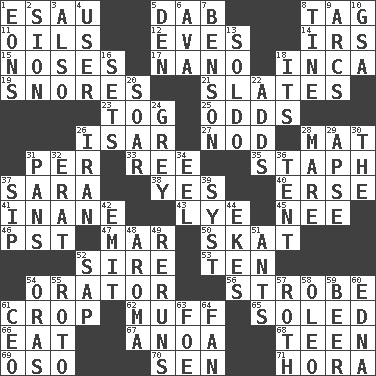 ACROSS 1. He sold his birthright 5. Pat or tap gently 8. Label 11. Lubricates 12. Nights before holidays 14. Big collection agency 15. Olfactory organs 17. Billionth: prefix 18. South American Indian 19. Sounds asleep 21. Chalkboards 23. Coat; cloak 25. Likelihood 26. Austrian river, tributary to the Danube 27. Allow head to fall sleepily 28. Floor covering 31. For each 33. Portuguese money of account (variant) 35. Staphylococcus 37. "Two Mules for Sister ____" 38. Affirmative reply 40. Celtic language 41. Empty; void 43. Sodium hydroxide 45. Born 46. Pacific Standard Time (abbr.) 47. Impair 50. Three-handed card game 52. Father 53. "___ Little Indians" 54. Speaker 56. Disco prop 61. Riding implement 62. Bungle 65. Having a sole or soles 66. Ingest 67. Small Philippine buffalo 68. Adolescent 69. Bear (Spanish) 70. Elected rep. 71. Israeli folk dance DOWN 1. Immeasurably long periods of time 2. The Jewish people; Israel 3. In addition 4. One who makes use of a thing 5. Lair 6. Actress Gardner 7. Gillaume's butler role 8. Prong on a fork 9. Arches 10. Girls' org. (abbr.) 13. Twentieth part of a lira 16. Arranges properly for use 18. It is 20. Fly high 22. Sums up 24. Jennifer or Joel 26. SW Asia republic 28. Female horse 29. Domed church section 30. Definite Article 31. Zero-star reviews 32. Part of Q.E.F. 34. Snakelike fish 36. Portable shelter 37. Small drink 39. System (abbr.) 42. Give off 44. Supplements with great effort 48. Scent 49. Summer TV shows 51. Pismires 52. Plant excrement 54. Mouths or openings 55. Printing process, for short 57. Writer of Portnoy's Complaint (1969) 58. Butter sub 59. Fermented drink made from hops 60. Pulitzer Prize-winning author Ferber 61. Corporate head (abbr.) 63. Enemy 64. Air blower
