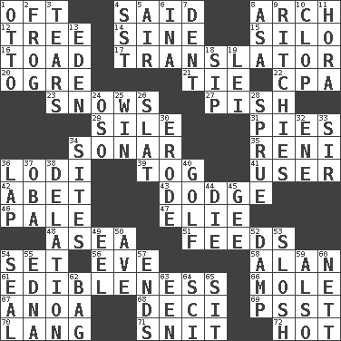 ACROSS 1. Often (poetically) 4. Stated 8. Bowlike part 12. Relationship diagram 14. Trig term 15. Grain storage tower 16. Frog relative 17. Interpreter 20. Legendary monster 21. Standoff 22. Accounting whiz (abbr.) 23. Frozen precipitation (plural) 27. Expression of disdain 29. Drop; flow; fall 31. Sliced desserts 34. Underwater navigation system 35. Painter Guido (1575-1642) 36. Farming town in central California 39. Coat; cloak 41. One who uses or employs something 42. Collude with 43. Evade 46. Diluted with white 47. Writer Wiesel 48. At sea 51. Eats 54. Arrange properly for use 56. Night before a holiday 58. Actor Alda or Thicke 61. The property of being fit to eat 66. Undercover agent 67. Small Philippine buffalo 68. Tenth: prefix 69. Inconspicuous attention getter 70. Austrian-born American filmmaker Fritz 71. In a ____ (agitated or irritated) 72. Being at a high temperature DOWN 1. Von Bismarck 2. Toadlike animal 3. Pulls into pieces 4. Fast jet (abbr.) 5. Atmosphere 6. _ tizzy (2 wds.) 7. Incision 8. White ___ sheet 9. Actors Guy, Robert Welles, and Clint 10. Hoof sound 11. Israeli folk dance 13. Locale of original sin 18. Small drink 19. Luau accessory 24. Bear (Spanish) 25. Victory 26. Narrow board 28. Upset 30. Eat (away) 32. Compass dir. 33. Title for a knight 34. Locates 36. Pet locale 37. Chief or king in Benin or Nigeria 38. Conveyance 40. Eighteen holes 44. Pass on 45. Turn to the right 49. Snakelike fish 50. "___ Maria" 52. Moist 53. Make a splashing sound 54. Lick closed 55. Pulitzer Prize-winning author Ferber 57. Extremities 59. In addition 60. Remaining after all deductions 62. Paper or plastic container 63. Car or cant ending 64. _-fi 65. Be seated