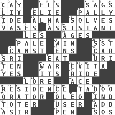 ACROSS 1. Island 4. Raised railways 7. Sinks 11. 54 in ancient Rome 12. Writer Wiesel 13. Friendly 14. Binary compound 15. _ mater 16. Finds the solution 17. Flower holders 19. Helper 21. French article 23. Eons 24. Diluted with white 25. Acquire through effort 26. Fast jet (abbr.) 29. 2nd pers. sing. pres. of can (arch.) 30. Followers of ems 31. 4-wheeled motor vehicle 32. Indian title of respect (Mr.) 33. Ingest 34. RI univ. 35. "___ Little Indians" 36. Armed conflict 37. Webber/Rice musical 40. It is so 41. ___ a Wonderful Life 42. Travel on or in a vehicle 43. Old wives' tales, e.g. 45. Adept person 46. Home 51. Off limits 55. Speaker 56. Butter sub 58. Indiana (abbr.) 59. Carrier 60. One who makes use of a thing 61. Find the sum of 62. SW Saudi Arabia district 63. Writing instrument 64. Distress signal DOWN 1. 154 in Roman numerals 2. Opera by Verdi 3. Jacques Cousteau's middle name 4. Pipe bend 5. Pale green bean 6. Oceans 7. Table seasonings 8. Inventor's middle name 9. Small, secluded valley 10. System (abbr.) 12. Artist's stands 13. Introduce or present, as a question 16. Public displays of written messages 18. Flair 20. Virtuous person 22. Put into a specified state 24. Aches 25. Erodes 26. Snake scale 27. "Two Mules for Sister ____" 28. Three (prefix) 29. Algonquian 32. Filthy place 33. Consumed 36. One who wires 37. Period 38. Winning man's name 39. It may be bright or harebrained 43. 61 cubic inches 44. Aroma 46. Round or rotation of duties 47. Greek god of love 48. Suttee (variant) 49. Overturn; upset 50. Otherwise 52. Prejudice 53. Southwest Nigerian state 54. Likelihood 57. Car or cant ending