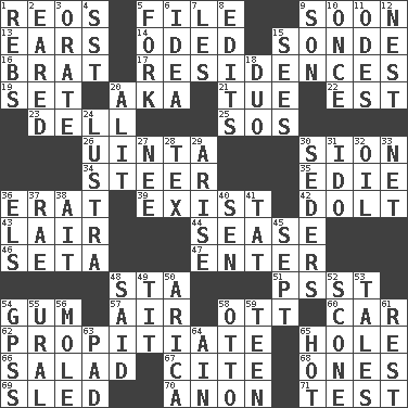 ACROSS 1. Vintage cars 5. Do some clerical work 9. Within a short period 13. Hearing organs 14. Wrote a lyric poem 15. Message 16. Naughty child 17. Dwellings 19. Arrange properly for use 20. Alias (abbr.) 21. Third day of the wk. 22. Eastern Standard Time (abbr.) 23. Small valley 25. Distress signal 26. National forest in Provo, Utah 30. The Jewish people; Israel 34. Guide 35. Singer Brickell 36. Part of Q.E.F. 39. Be 42. Stupid person 43. Den 44. Gospel singer Marvin 46. Bristle 47. Keyboard key 48. R.R. building 51. Inconspicuous attention getter 54. Chewing product 57. Wind 58. Baseball player Mel 60. 4-wheeled motor vehicle 62. Appease 65. Hollow 66. First course 67. Quote 68. Washington bills 69. Downhill vehicle 70. Soon (poet.) 71. Trial DOWN 1. Confederate soldiers (slang) 2. Having ears or earlike features 3. Speak pompously 4. Fast jet (abbr.) 5. Tined utensil 6. The content of cognition 7. French article 8. Proofreads 9. Manchild 10. At one time in the past 11. Lyric poems 12. A home for chicks 15. Observes 18. Superhero pair 20. Set down 24. A period of five years 27. Born 28. John Ritter's dad 29. Originate 30. Spring feasts 31. Wedding promise 32. Lubricate 33. Fish or hair follower 36. Raised railways 37. Actress Charlotte 38. Small island 40. Elected rep. 41. Make lace 45. Back-to-school mo. 48. Alleged 49. Teat (slang) 50. N. Chile seaport 52. Biscuitlike quick bread 53. Stories 54. Global Positioning Systems (abbr.) 55. Mountain range 56. Undercover agent 58. "Beetle Bailey" pooch 59. Adolescent 61. Relief 63. Groovy apt. 64. The 18th letter of the Arabic alphabet 65. Being at a high temperature
