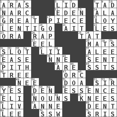 ACROSS 1. Ancient river in northeast Turkey 5. Flaplike covering 8. Small amount or degree 11. Drug cop 12. Genesis locale 14. According to 15. Relatively large 17. Part 18. Myrna of the movies 19. Small, flat, pigmented spot on the skin 21. Small island 22. French article 23. Mouth or opening 24. Strike 25. Make lace 27. Snakelike fish 28. Floor coverings 31. Groove 35. Cards in a Roman deck? 37. Toward shelter 38. Comfort 39. Compass dir. 41. Posted 42. Essential or central part 43. "We ___ not amused" (Victoria) 45. Fast planes 46. Woody plant 47. The grampus (Milton) 49. Born 51. ___ good deed 52. Title for a knight 55. Affirmative reply 57. Lair 60. Center 62. Biblical high priest 63. Parts of speech 65. Leg joints 66. 54 in ancient Rome 67. Singer Murray 68. Incision 69. Area sheltered from the wind 70. Compass dir. 71. Indian titles of respect DOWN 1. White American of non-Hispanic descent 2. More valued for its uncommonness 3. Sports stadium 4. Go away! 5. Flowery wreath 6. It may be bright or harebrained 7. Tenth: prefix 8. Baron Munchausen's specialties 9. _ vera 10. 24-hour periods 13. Remaining after all deductions 16. Hoop that covers a wheel 17. Cotton for raincoats, e.g. 20. Highlander 26. Collect or gather 29. Portable shelter 30. Puts into a specified state 31. Back-to-school mo. 32. Den 33. Clearly or manifestly demonstrative 34. Giggle 36. _ tizzy (2 wds.) 40. Eats (away) 44. Greek god of love 48. Keg 50. Pulitzer Prize-winning author Ferber 52. Contemptuous expression 53. Ancient Celtic tribe of eastern Britain 54. Musical pauses 55. Shout 56. Writer Wiesel 58. Immeasurably long periods of time 59. Religious women 61. Conclusions 64. ___ Haven, CT