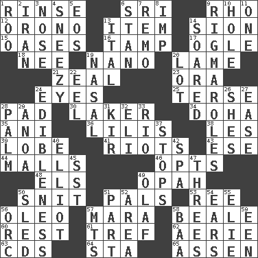 ACROSS 1. Remove soap 6. Indian title of respect (Mr.) 9. 17th letter of the Greek alphabet 12. U. of Maine site 13. A distinct part 14. The Jewish people; Israel 15. Fertile tracts in a desert 16. Pack (down) 17. Stare 18. Born 19. Billionth: prefix 20. Unable to walk 21. Ardor 23. Mouth or opening 24. Snake ____ (dice throw) 25. Laconic 28. Groovy apt. 30. Member of a famous L.A. basketball team 34. Capital of the state of Qatar 35. Black tropical American cuckoo 36. Ms. Damita and namesakes 38. French article 39. Ear part 41. Disturbances 43. Compass dir. 44. Promenades 46. Elects 48. Raised railways 49. Brightly colored fish 50. In a ____ (agitated or irritated) 51. Friends 53. To riddle 56. Margarine 57. Hindu Mythology: god of death 58. Calif. Air Force Base 60. Repose 61. Not kosher 62. Nest on high 63. Music discs 64. R.R. building 65. NE Netherlands city DOWN 1. Friend of Pooh 2. SW Asia republic 3. Characteristic smell of wine 4. Dwarf with a sinus problem 5. Greek goddess of the dawn 6. Comedian Laurel of Laurel & Hardy 7. San ____ (Riviera town) 8. Mischievous child 9. Complicated, petty procedures 10. Opening into or through something 11. Single 13. Slanted text style (abbr.) 14. Flew 19. Rhinal 20. Car dealer's back yard 22. Snakelike fish 24. The property of being fit to eat 26. "______ My Girl" (Turtles hit) 27. Comfort 28. Inside of hand 29. Small Philippine buffalo 31. Apertif with cassis 32. Biblical high priest 33. _ de Janeiro 37. Halts 40. American author Paul (1891-1958) 42. Health resort 45. Fast jet (abbr.) 47. Trios 49. Norwegian king 50. Downhill vehicle 51. Component 52. Type of rug 54. Hearing organs 55. Writer Wiesel 56. The grampus (Milton) 57. Mountains (abbr.) 58. Sound made by sheep 59. Car or cant ending