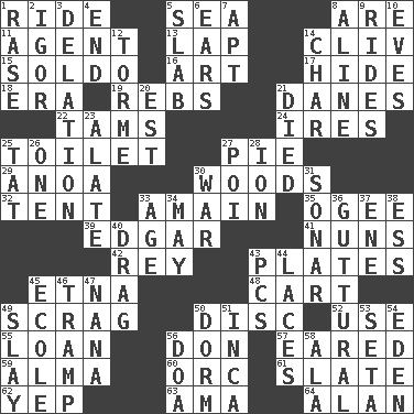 ACROSS 1. Travel on an animal 5. Ocean 8. "We ___ not amused" (Victoria) 11. Representative 13. Pet locale 14. 154 in Roman numerals 15. Twentieth part of a lira 16. Nonscientific branch of learning 17. Flintstone garb 18. Epoch 19. Confederate soldiers (slang) 21. Natives or inhabitants of Denmark 22. Scottish caps 24. Angers 25. Rest room 27. Sliced dessert 29. Small Philippine buffalo 30. Forest 32. Portable shelter 33. With great haste 35. Double curve, resembling the letter S 39. _ Allan Poe 41. Religious women 42. Marina Del _, California 43. Food holders 45. Inactive volcano in Sicily 48. Heavy open wagon 49. Lean end of the neck 50. Flat circle 52. Purpose 55. Grant temporary use of 56. Spanish title 57. Having ears or earlike features 59. _ mater 60. The grampus (Milton) 61. Chalkboard 62. Slangy assent 63. Nursemaid (var.) 64. ____ Jay Lerner DOWN 1. Raze (variant) 2. Russian composer Stravinsky 3. Conveyance 4. Conclude 5. Broad, flat, thick piece 6. Hearing organs 7. Fitting 8. Place in a line 9. Amusement-park features 10. Nights before holidays 12. Singer Mel 14. Burn to charcoal 20. Eastern Standard Time (abbr.) 21. Passed on 23. Having winglike extensions 25. Make lace 26. Single 27. Luau course 28. Electrically charged atom 30. Armed conflict 31. Echolocation 33. Grow older 34. Can I? 36. From the throat 37. Compass dir. 38. Double-curved letter 40. To be drawn or hauled along 43. Personal Computers (abbr.) 44. Shoestrings 45. Learning spot: Fr. 46. _____ steamer (cargo ship) 47. Nanny 49. Kill 50. Dormintory (informal) 51. South American Indian 53. Bristle 54. Paradise 56. ___ good deed 58. According to