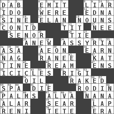 ACROSS 1. Small moist lump or mass 4. Give off 8. One who doesn't tell the truth 12. Wedding promise 13. Past tense of be (plural) 14. Pulitzer Prize-winning author Ferber 15. Trig term 17. Liveliness 18. Parts of speech 19. Continued (abbr.) 21. Teat (slang) 23. Born 24. Sir (Sp.) 26. Neckwear 28. Afresh 30. Nineveh was its capital 34. White ___ sheet 37. Age 39. Merit 40. Tired old horse 41. The wife of a rajah (variant) 43. Krazy ___ of comics 44. Prong on a fork 46. 480, 500 or 516 sheets of paper 47. Followers of ems 48. Winter's stalactites 51. Swiss mountan, "Queen of the Mountains" 54. Petroleum 55. Moved through 58. Health resort 61. Pass on 63. "The Thinker" sculptor 65. Insides of hands 67. Inventor's middle name 71. Nanny 72. Having or resembling wings 73. Dry up 74. Pet locale 75. Painter Guido (1575-1642) 76. Wig 77. Period DOWN 1. Compact _ 2. Goodbye (Sp.) 3. Maid-servant 4. She-sheep 5. Cartoonist voice _ Blanc 6. Lyricist Gershwin 7. Portable shelter 8. Lion 9. Goddess of spring and wife of Bragi 10. Queen of England 1702-14 11. Raze (variant) 16. Inactive volcano in Sicily 18. Nuclear Threat Initiatives 20. Spanish title 22. ___ a Wonderful Life 25. Located in or toward the back 27. Sight organ 29. Puts on (as clothing) 30. Approach 31. Libertine 32. SW Asia republic 33. Pismires 34. Opposed to 35. Ketch in the Levant 36. Hindu god of fire 38. Single 42. Arab leader 45. Environmental prefix 49. Hats (slang) 50. Connecticut Ivy Leaguer 52. Slender fish 53. Picture 56. Peak District village in England 57. Middle Eastern gold or silver currency 58. Coast Guard woman 59. Light colored 60. Actor Alda or Thicke 62. Compass direction 64. California wine valley 66. Medical imaging device (abbr.) 68. Area sheltered from the wind 69. Large container 70. "We ___ not amused" (Victoria)