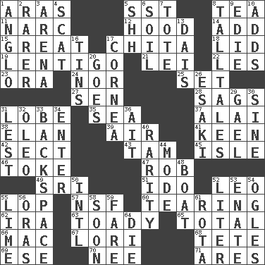 ACROSS 1. Caspian sea tributary 5. Fast jet (abbr.) 8. Afternoon social gathering 11. Drug cop 12. Parka part 14. Find the sum of 15. Relatively large 17. Riviera of "Kiss of the Spider Woman" 18. Flaplike covering 19. Small, flat, pigmented spot on the skin 21. Luau accessory 22. French article 23. Mouth or opening 24. And not 25. Put into a specified state 27. Elected rep. 28. Sinks 31. Ear part 35. Ocean 37. Mountain range southwest of Kyrgyzstan 38. Enthusiasm 39. Atmosphere 41. Peachy ____! 42. Religious group 43. Scottish cap 45. Small island 46. Casino tip 47. Director Reiner 49. Indian title of respect (Mr.) 51. Wedding promise 52. Lion 55. Chop off 57. Science/research agcy. 60. Pulling into pieces 62. Retirement account (abbr.) 63. Sycophant 65. "_____ Recall" 66. Apple computer (short form) 67. Australian parrot (variant) 68. Wig 69. Compass dir. 70. Born 71. Ancient Greek god of war DOWN 1. White American of non-Hispanic descent 2. More uncommon 3. Sports stadium 4. Jazz singing style 5. Quiet! 6. Earth 7. Carry 8. Baron Munchausen's specialties 9. Singer Brickell 10. Does sums 13. Raised platform 16. Metal containers 17. Pupil covering 20. Leaves 26. 1973 Nobel Price Winner (Physics) Leo 29. Highlander 30. Trig term 31. For fear that 32. Margarine 33. Keyboard key 34. Keyboard key 36. Small island 40. Noteworthy scarcity 44. Method 48. Water vessel 50. International (abbr.) 52. 61 cubic inches 53. Maternal 54. Stares 55. Welles in "The Third Man" 56. Mouths or openings 58. Within a short period 59. Conductor's collection 61. Round or rotation of duties 64. Pass on