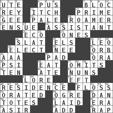 ACROSS 1. Shoshoni 4. Ichor 7. Alliance 11. Marina Del _, California 12. Hankering 13. A-one 14. Turn to the right 15. Light colored 16. Nomad 17. Take place subsequently 19. Helper 21. Environmental prefix 23. Singles 24. Narrow board 25. Raised railways 26. Lion 29. Opt 30. Born 31. Globe 32. Auto club (abbr.) 33. Groovy apt. 34. Mouth or opening 35. Air pressure measure (abbr.) 36. Ingest 37. Leaves out 40. Nine, plus one 41. Had dinner 42. Religious women 43. Old wives' tales, e.g. 45. Newt 46. Dwelling 51. Soft thread for cleaning between teeth 55. Spoke pompously 56. Legendary monster 58. One of the 12 tribes of Israel 59. Lugs 60. Put down 61. Epoch 62. SW Saudi Arabia district 63. Say or write further 64. Strike DOWN 1. Goad 2. Adolescent 3. Sight organs 4. Parent Teacher Assoc. 5. Southern CA. univ. 6. "______ My Girl" (Turtles hit) 7. Naughty children 8. Pale green bean 9. Presage 10. Foregone conclusion 12. Medicinal drug used to evoke vomiting 13. Airs 16. Wash lightly 18. Ubangi River tributary 20. Having a sole or soles 22. Baseball player Mel 24. Killed 25. Related on the mother's side 26. Plunders 27. Blunders 28. Chief or king in Benin or Nigeria 29. Comfort 32. Fitting 33. Eucharist need 36. Having ears or earlike features 37. Single 38. Bungled 39. International (abbr.) 43. 61 cubic inches 44. Lyric poems 46. Roll call or roster of names 47. Greek god of love 48. Suttee (variant) 49. Root beer relative 50. Mild oath 52. River in Europe 53. "Two Mules for Sister ____" 54. Fastener 57. To free from