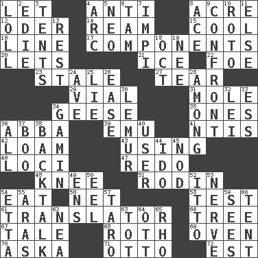 ACROSS 1. Allow 4. Against 8. Land measure 12. River in Europe 14. 480, 500 or 516 sheets of paper 15. Calm and collected 16. Actor's bit 17. Parts 20. Allows 21. Frozen water 22. Enemy 23. Having lost freshness 27. Separate forcefully 29. Small bottle 31. Undercover agent 34. Honkers 35. Washington bills 36. Swedish rock group 39. Australian flightless bird 41. Nuclear Threat Initiatives 42. Rich soil 43. Exploiting 46. Event scenes 47. Redecorate 48. Leg joint 51. "The Thinker" sculptor 54. Ingest 56. Fish or hair follower 58. Trial 61. Interpreter 66. Family _ (genealogy) 67. Falsehood 68. Writer of Portnoy's Complaint (1969) 69. Baking chamber 70. "____ silly question..." 71. "Beetle Bailey" pooch 72. Eastern Standard Time (abbr.) DOWN 1. Hang loosely or laxly 2. Singer Brickell 3. Portable shelters 4. Curve 5. Modern: prefix 6. Scottish cap 7. Body of Kaffir warriors 8. Adept person 9. Meet 10. Printing process, for short 11. Otherwise 13. Take ten 18. Sep. follower 19. Born 24. "___ Maria" 25. Untruth 26. Comfort 28. Amid 30. Arboreal primate 32. Flowery wreath 33. Double-curved letter 34. Homeless child 36. Everything 37. Surprise greeting 38. Sass 40. One who makes use of a thing 44. Wedding promise 45. Lower and raise head in agreement 49. Followers of ems 50. Snakelike fish 52. "Tell ____ the Marines!" 53. Impudent aggressiveness 54. Singer James 55. Caspian sea tributary 57. Pacific island yam 59. Observes 60. Portable shelter 62. Teachers' org. 63. Small child 64. Baseball player Mel 65. 17th letter of the Greek alphabet