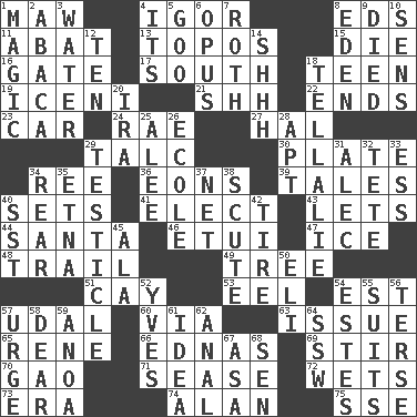 ACROSS 1. Opening into something insatiable 4. Russian composer Stravinsky 8. Begley and Asner 11. Blind as ____ 13. Literary convention 15. Expire 16. Yard entry 17. Compass direction 18. Adolescent 19. Ancient Celtic tribe of eastern Britain 21. Quiet! 22. Extremities 23. Automobile 24. Actress Charlotte 27. Actor Linden 29. Baby powder 30. Food holder 34. To riddle 36. Immeasurably long periods of time 39. Falsehoods 40. Arranges properly for use 41. Choose 43. Allows 44. Before Barbara or Clara 46. Needle case 47. Frozen water 48. Go after with the intent to catch 49. Relationship diagram 51. Island 53. Snakelike fish 54. Eastern Standard Time (abbr.) 57. Allodial 60. By way of 63. Come out of 65. French philosopher Descartes 66. Ferber et al. 69. Move through with a circular motion 70. E Mali city 71. Gospel singer Marvin 72. Soaks 73. Period 74. ____ Jay Lerner 75. Compass dir. DOWN 1. Mysterious quality of enchantment 2. Phillipine bananalike plant 3. Wetness 4. It is 5. Thick or sticky substance 6. Musical composition 7. Writer of Portnoy's Complaint (1969) 8. Paradise 9. Passed on 10. Elected reps. 12. Nine, plus one 14. Quiet! 18. Copy Pinocchio 20. Retirement account (abbr.) 25. Toward shelter 26. Learning spot: Fr. 28. Fitting 29. One of the two male reproductive glands 31. Actor Baldwin 32. Wig 33. Double-curved letter 34. Hitchcock's "____ Window" 35. Inactive volcano in Sicily 37. Fish or hair follower 38. Turtle shell scale 40. Fast jet (abbr.) 42. Hoop that covers a wheel 45. In the manner of 50. Biblical high priest 52. Jacques Cousteau's middle name 54. _____ Park, CO 55. Sets of matching outer garments 56. Laconic 57. Goad 58. Letter starter 59. Small Philippine buffalo 61. The main thing one is thinking about 62. Of or related to the anus 64. Compass dir. 67. White ___ sheet 68. Elected rep.